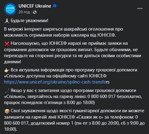 На офіційній сторінці у соцмережах Дитячого фонду ООН (ЮНІСЕФ) в Україні з’явився пост-підтвердження, що дана роздача шкільних наборів – фейк. Ніяких заявок фонд не приймає.