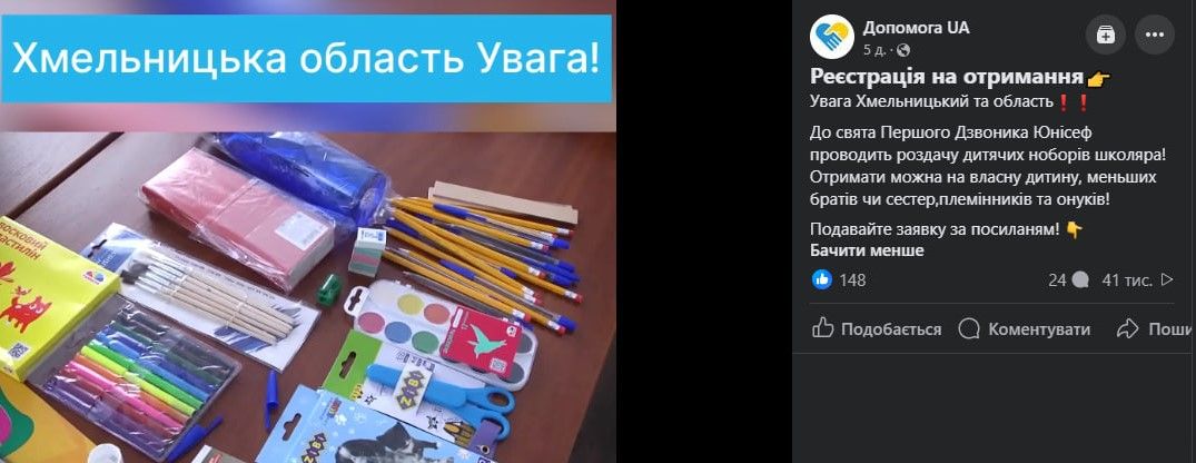 У соціальній мережі Facebook розповсюджується відео із інформацією про те, що всі жителі Хмельницької області можуть безкоштовно отримати шкільні набори до свята першого дзвоника. В дописі зазначено, що забрати «пакунок» можуть всі і не обов’язково лише для своєї дитини, а й для сестер, братів, племінників та онуків. Потрібно лише оформити заявку за посиланням, якого, до слова, немає під дописом. А цією «благодійністю» займається Дитячий фонд ООН (ЮНІСЕФ) в Україні.