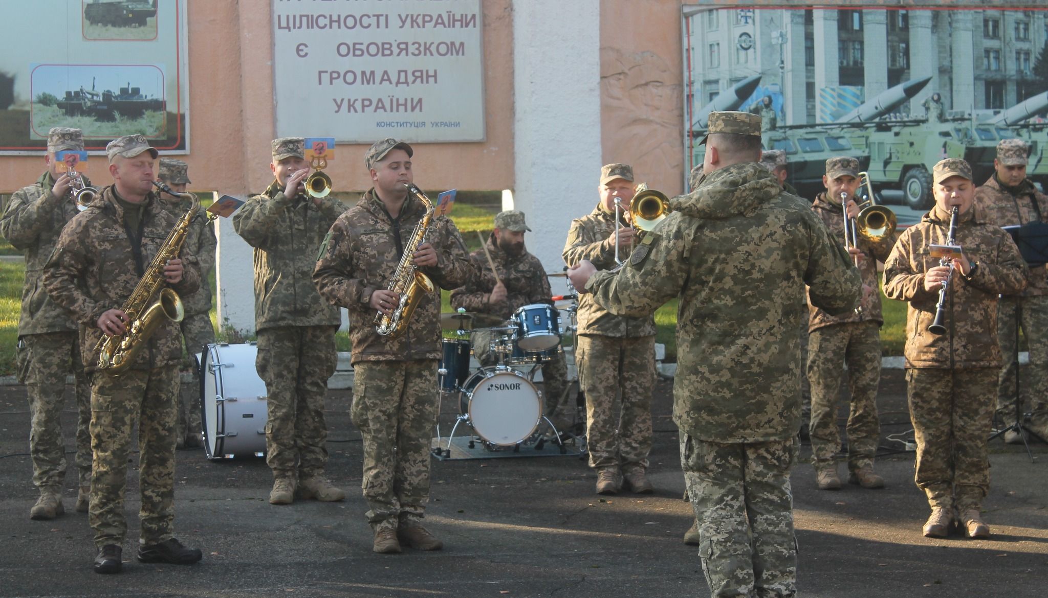 Та все ж на плацу лунали щирі вітання від командування, волонтерів, представників влади й музичні дарунки від оркестру.