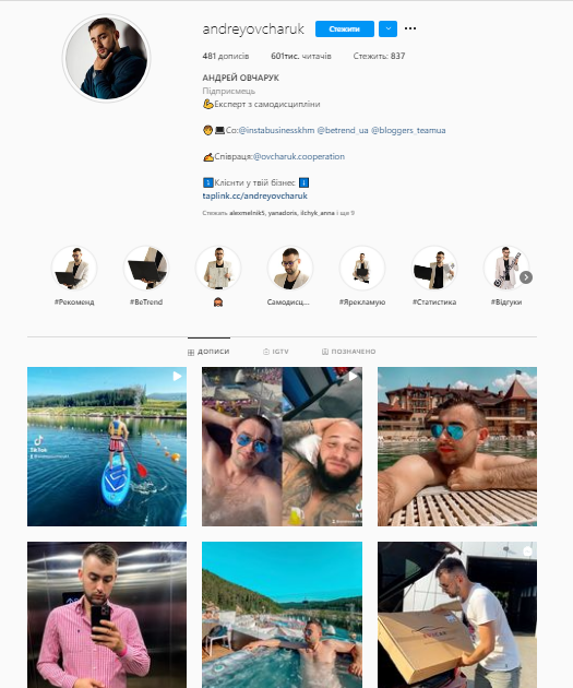 Підприємець Андрій Овчарук - так звати хмельничанина, в якого найбільше підписників зі всіх інших блогерів з нашої підбірки. За чоловіком стежить 601 тисяча людей. Основна діяльність хмельничанина - маркетинг, таргет і SMM. До слова, його діяльність пов’язана з усіма сучасними напрямками. Андрій пропонує просування в соцмережах, створення сайтів, організацію розіграшів, івентів та інше.