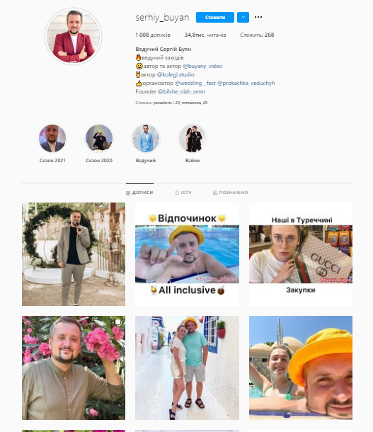 У “сторіс” блогер розповідає про особисте й часто показує моменти зі своєї роботи - проведення свят. Його блог змушує від душі посміятися. А креативна робота слугує порцією натхнення.