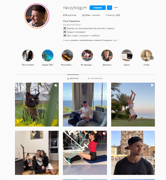 “Тренер за покликанням без понтів і пафосу”, - так каже про себе хмельничанин Пєтя Навойтко. Навіть з шапки його профілю можна зрозуміти, що його сторінка ґрунтується переважно на спортивній тематиці.
