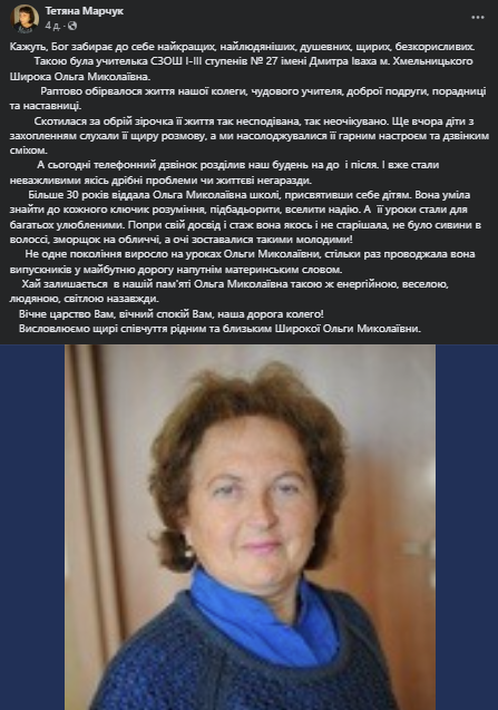 - Дуже шкода побачити таку новину. Наш класний керівник... Царства Небесного і світла пам'ять, - пишуть колишні учні Ольги Широкої.