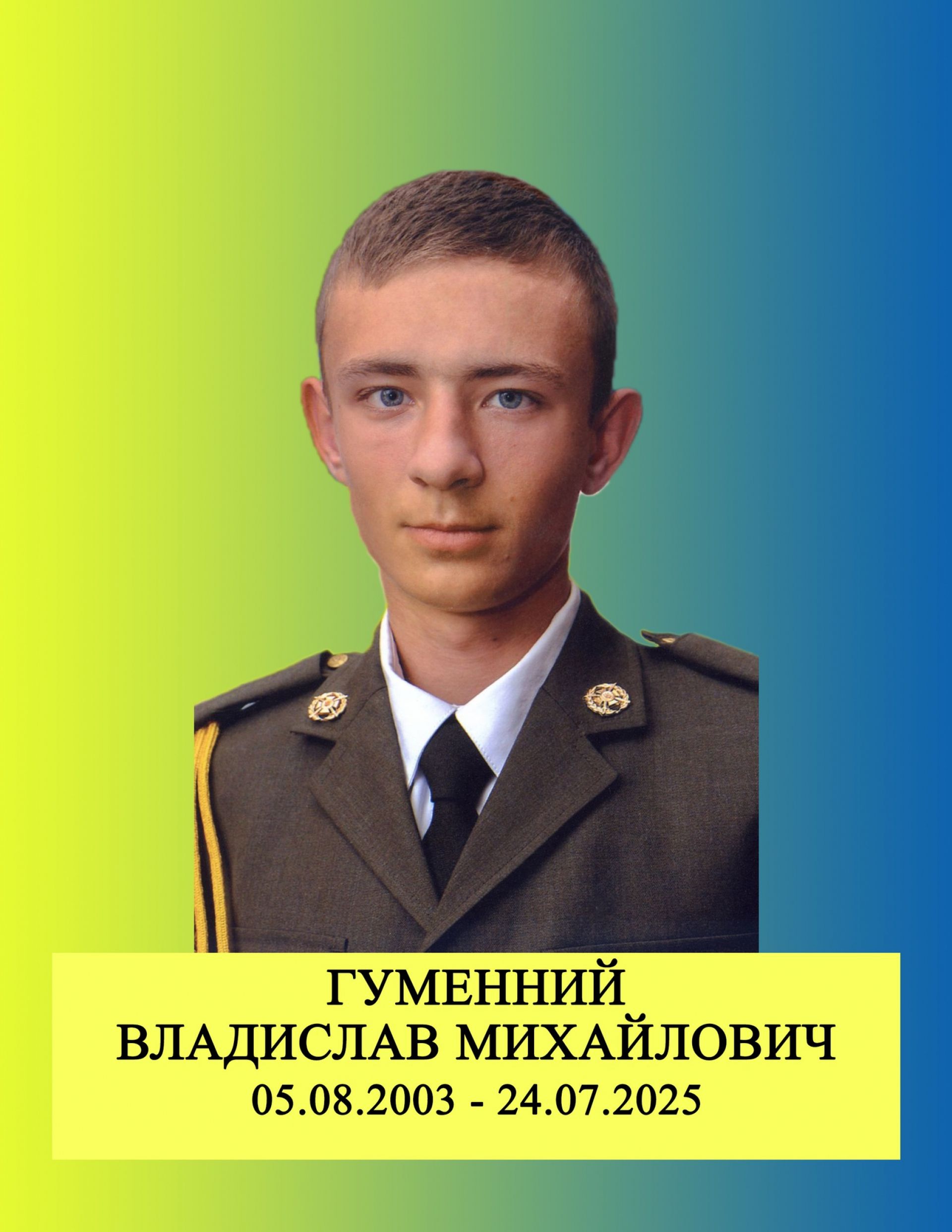 30 липня у Старокостянтинівській громаді прощалися з юним Героєм — Владиславом Гуменним. Він народився 5 серпня 2003 року, мешкав у селі Григорівка. Був старшим лейтенантом. Служив захисник на Донеччині. 24 липня 2025 року під час виконання бойового завдання Владислав загинув. Це сталось поблизу села Новоекономічне Покровського району. Йому було лише 21 рік.