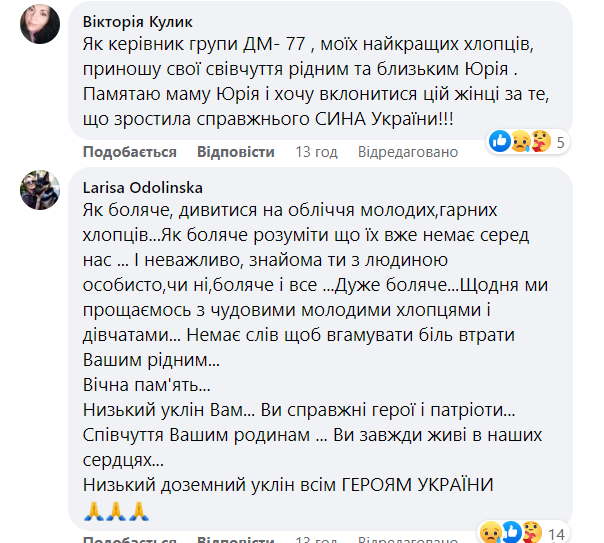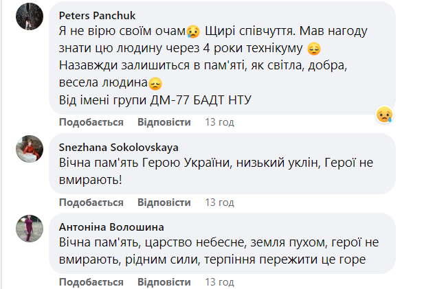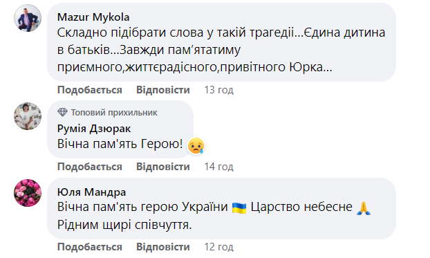 Під дописом знайомі та близькі Воїна діляться спогадами та висловлюють щирі співчуття рідним загиблого.