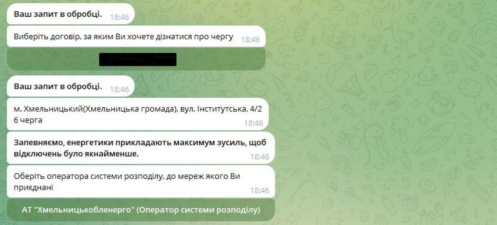 Заразом про свою чергу можна дізнатися через чат-бот «iEnergoBot» – він працює у таких месенджерах, як Telegram та Viber: посилання на них зазначені на сайті «Хмельницькобленерго». Обираєте відключення, вказуєте номер особового рахунку або номер телефону, до якого він прив’язаний і отримаєте інформацію про свою чергу. Варто зауважити: ресурс не завжди працює коректно.
