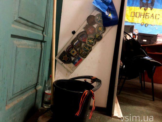У кутку, біля смітника з георгіївськими стрічками, висять шеврони здобуті в бою. Їх наші військовослужбовці здерли в окупантів.