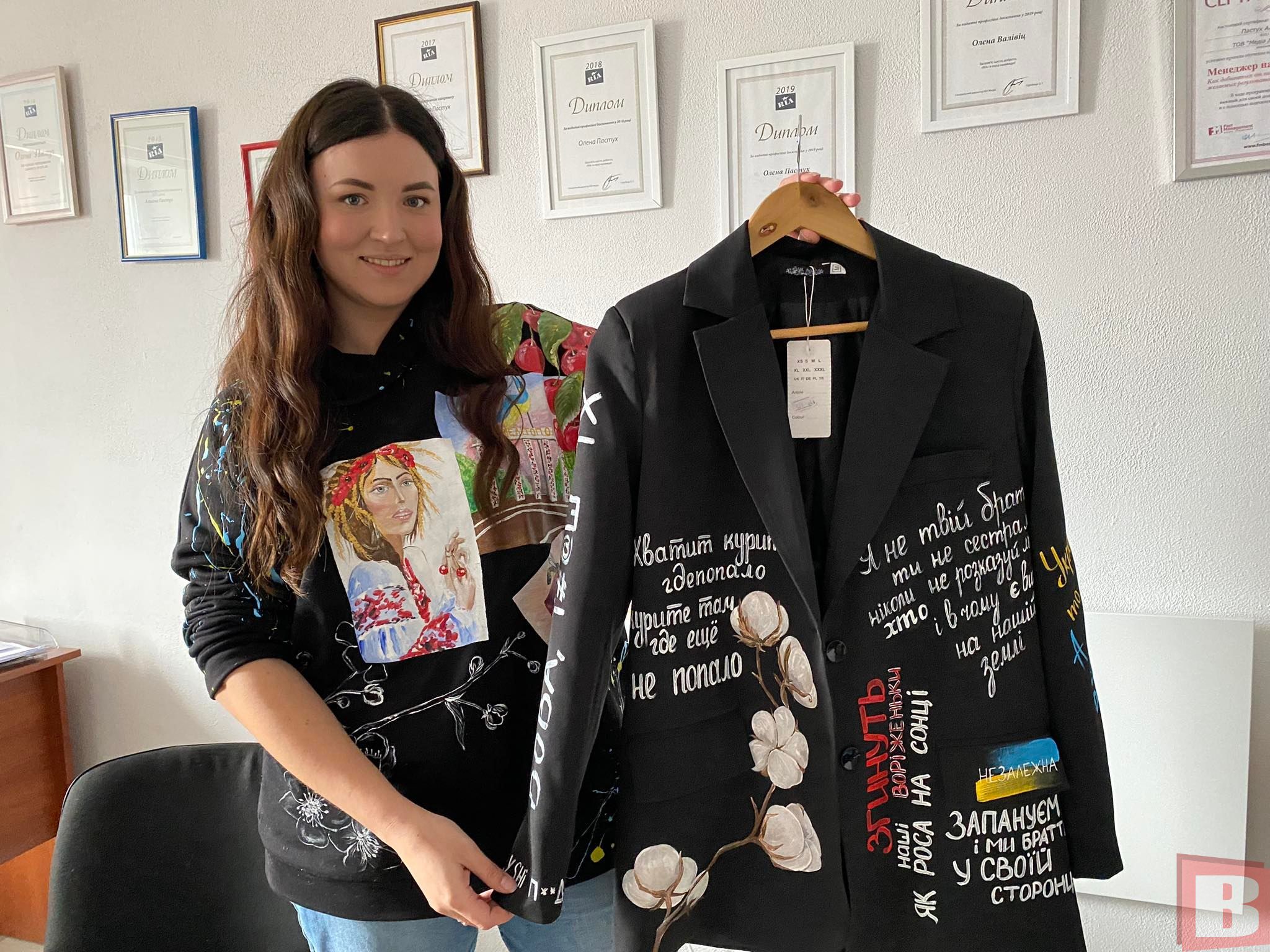 - У мене в Мелітополі була своя студія краси. Я візажист і стиліст. Тож коли приїхала в Хмельницький, у мене була депресія. Адже я залишилася без своєї справи. Тоді я подумала, чим можу бути корисною тут і зараз. І спало на думку розмальовувати речі. Спершу зробила це для своїх подруг і в мене вийшло. Я знайшла постачальників речей. Це одесити, які відшивають піджаки. Так я і їх підтримую. Адже і в них є робота, і в мене. Тоді знайшла текстильні фарби українського виробництва. Вони не вимиваються і не лущаться. Так і почала цим займатися. 20% з продажу речей я віддаю для Збройних Сил України. Тому в такий спосіб допомагаю нашим військовим, - говорить Тетяна.