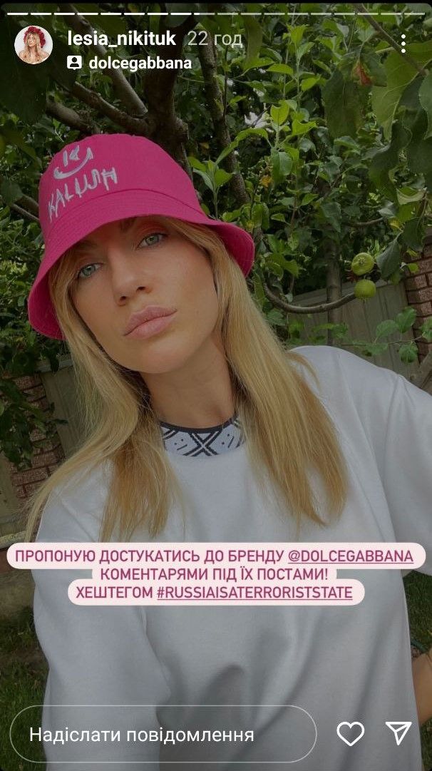 У своїх сторіс в Інстаграм Нікітюк закликала шанувальників залишати на сторінці бренду в соцмережах хештег #russiaisaterroriststate. Наводимо вам скріни зі сторіс Лесі, аби ви змогли все побачити коли ті зникнуть.