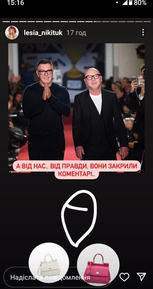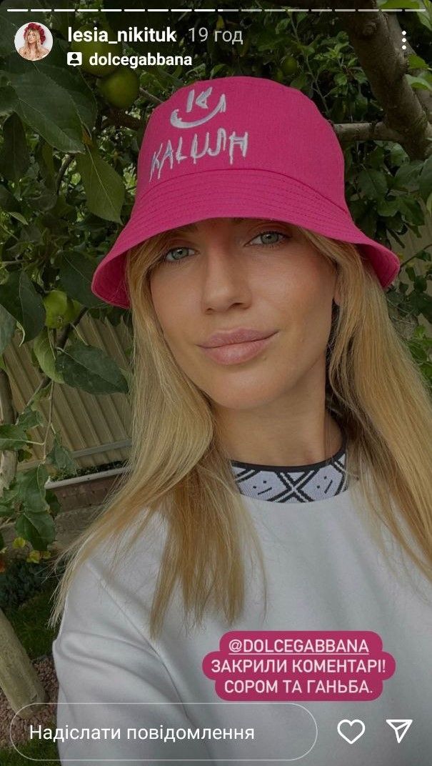 "Dolce & Gabbana закрили коментарі. Сором і ганьба. Від нас, від правди, вони закрили коментарі", — повідомила хмельничанка.