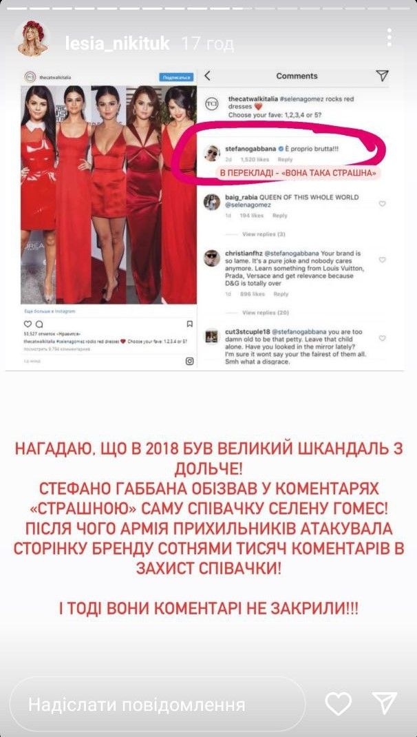 Вона пригадала, що модельний дім вже раніше потрапляв в гучний скандал. Стефано Габбана образив американську співачку Селену Гомес, написавши обурливий коментар під її фото "Вона така страшна". Тоді на них зірвалася хвиля критики від шанувальників Гомес, але навіть в тій ситуації “Dolce&Gabbana” не закривали коментарі.