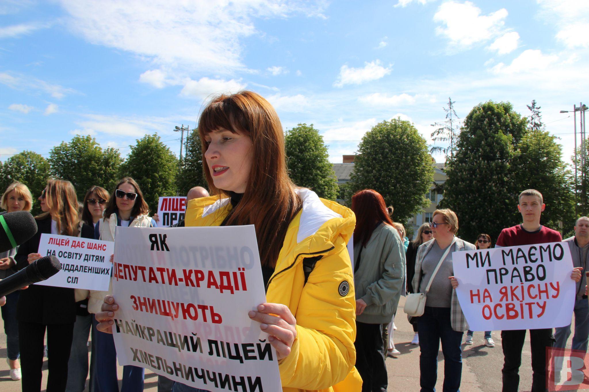 – Хоча моя дитина і закінчує цей ліцей, я не могла не прийти сьогодні, для того, щоб сказати своє слово, не тільки як мати, а як член хмельницької громади. Я вважаю, що такі рішення про скорочення вчителів, таких навчальних закладів, які має велике значення для всієї області – не можуть прийматися у кабінетах. Їх скорочують не думаючи, що завтра вони можуть бути потрібні в нашій хмельницькій громаді, – пояснила занепокоєна мати.