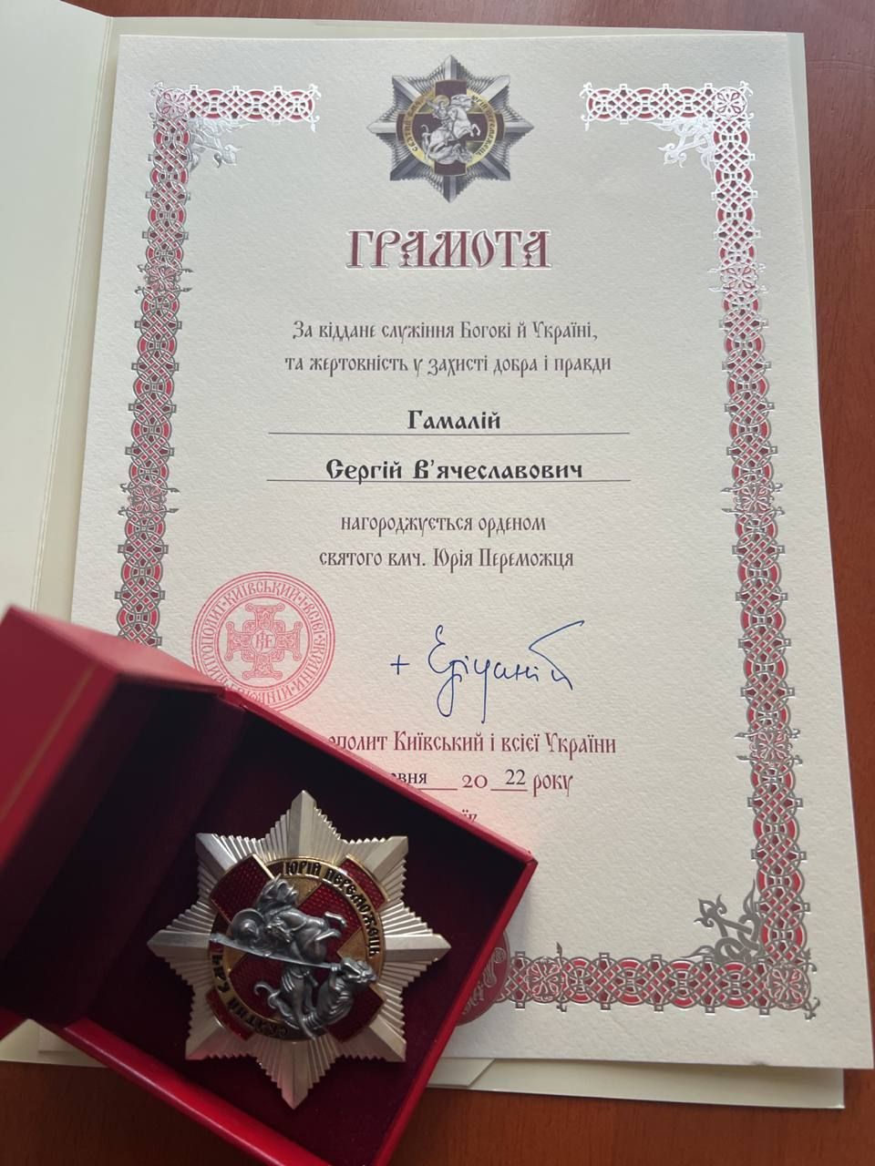 “Сьогодні дуже хвилюючий для мене день, адже я мав честь отримати від Митрополита Епіфанія високу нагороду: орден святого великомученика Юрія Переможця на честь Юрія (Георгія) Змієборця. А ще символічно, що саме цього дня наші військові відбили острів Зміїний,” - написав у своєму Телеграм-каналі Сергій Гамалій.