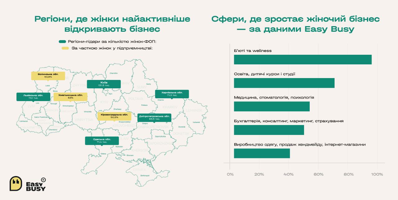 «Б’юті-індустрія, психологія, стоматологія, маркетинг, освітні курси, студії йоги чи масажу. Там, де йдеться про клієнтів і персоніфіковану якість — там і жінки. І це не лише економічна динаміка, а й соціальний барометр: пані в Україні не чекають “кращих часів” — вони вже сьогодні створюють робочі місця, запускають сервіси, підтримують свої громади» — зазначає Дмитро Денисов, співзасновник Easy Busy.