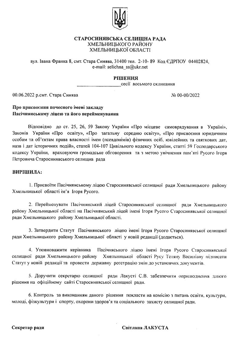 “Колектив Пасічнянського ліцею вважає за доцільне, враховуючи вищезазначені заслуги Ігоря Петровича перед Україною, з метою виховання підростаючого покоління на прикладах наших героїв-земляків присвоїти Пасічнянському ліцею ім’я Ігоря Русого. Наш високий громадянський обов’язок – увічнити світлу пам'ять усіх полеглих за незалежність і територіальну цілісність України, ” - йдеться на сайті Старосинявської селищної ради.