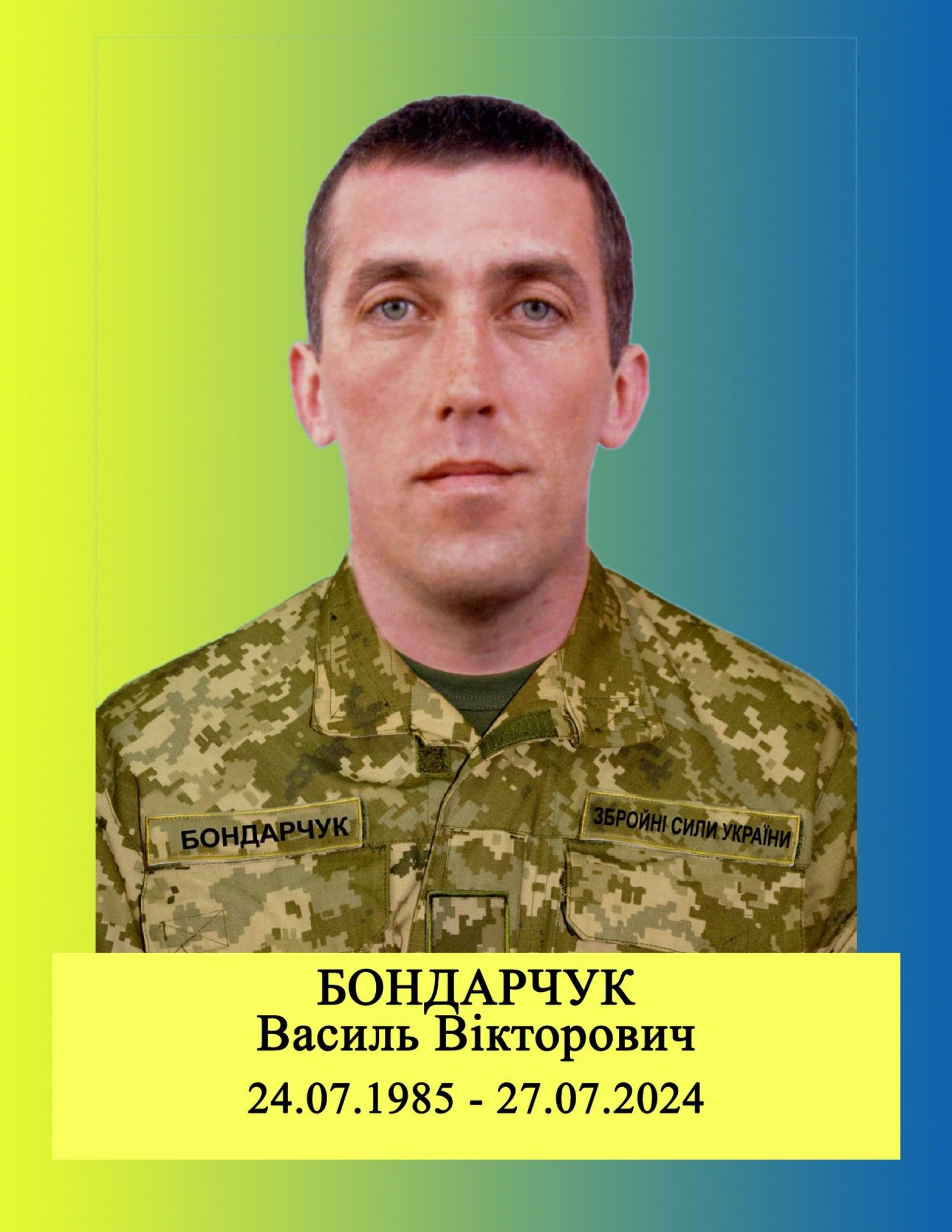 Як розповіли в Старокостянтинівській міській раді, Василь Бондарчук був мобілізований до лав ЗСУ у червні 2022 року. 25 липня 2024 року під час виконання бойового завдання поблизу населеного пункту Невське Сватівського району Луганської області боєць отримав поранення. 27 липня Василь Бондарчук помер від ускладнень у лікарні міста Дніпро. Йому було 39 років. У військовослужбовця залишились батько, дружина, доросла донька та двоє неповнолітніх дітей.