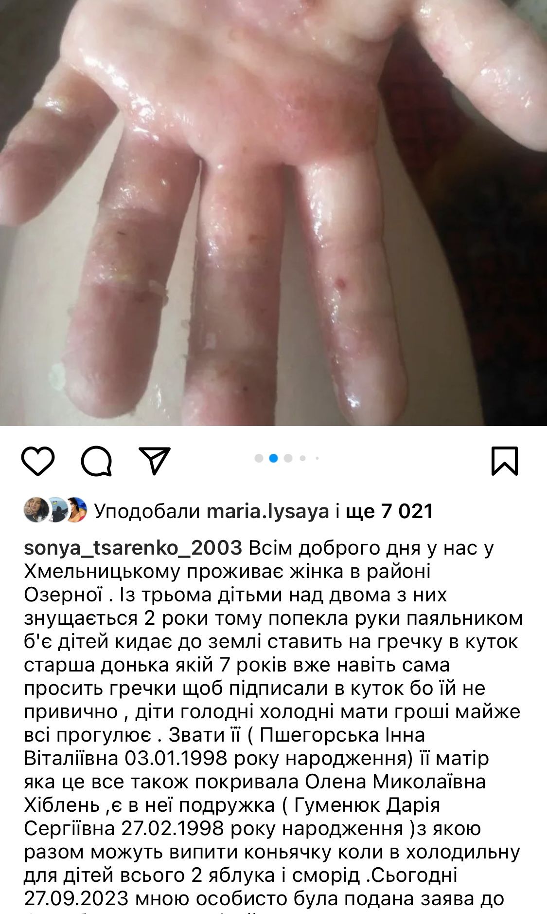 - У нас у Хмельницькому проживає жінка в районі Озерної. Із трьома дітьми. Над двома з них знущається. 2 роки тому попекла руки паяльником, б'є дітей, кидає до землі, ставить на гречку в куток. Старша донька, якій 7 років, вже навіть сама просить гречки, щоб підписали в куток, бо їй не привично. Діти голодні, холодні. Мати гроші майже всі прогулює. Звати її Пшегорська Інна Віталіївна 03.01.1998 року народження. Її матір, яка це все також покривала, Олена Миколаївна Хіблень. Є в неї подружка (Гуменюк Дарія Сергіївна 27.02.1998 року народження), з якою разом можуть випити коньячку, коли в холодильнику для дітей всього 2 яблука і сморід, - йдеться в дописі.