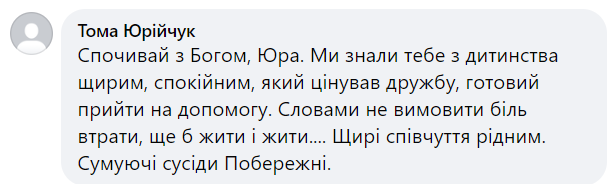 В соцмережах кожен другий коментар про те, що Юрію ще “жити й жити”, "гине цвіт нації", друзі, сусіди, родичі, знайомі та незнайомі співчувають рідним та тужать разом з ними: