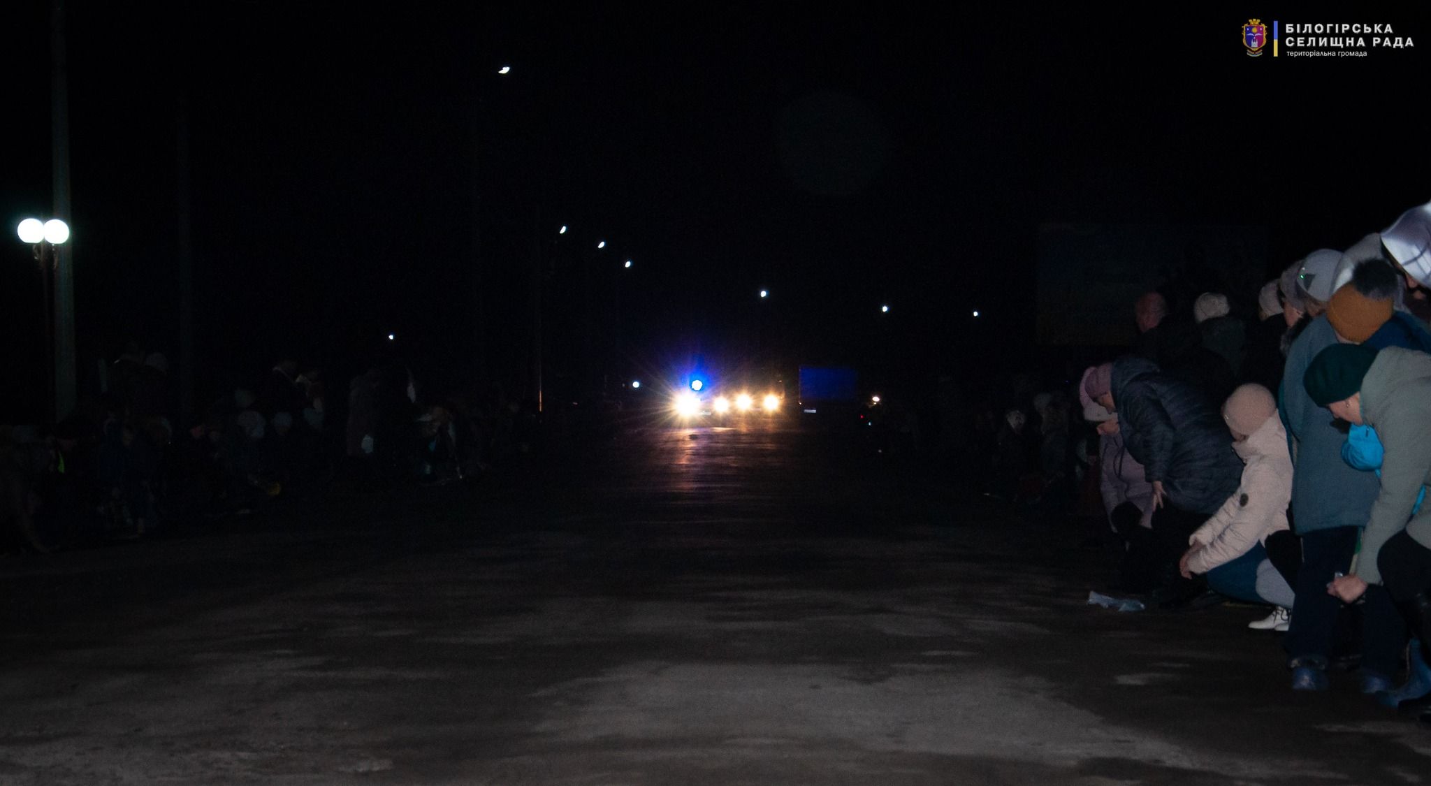 Живим коридором, навколішки, схиливши голови в знак шани, мешканці Білогірської громади 28 грудня зустріли тіло загиблого Героя.