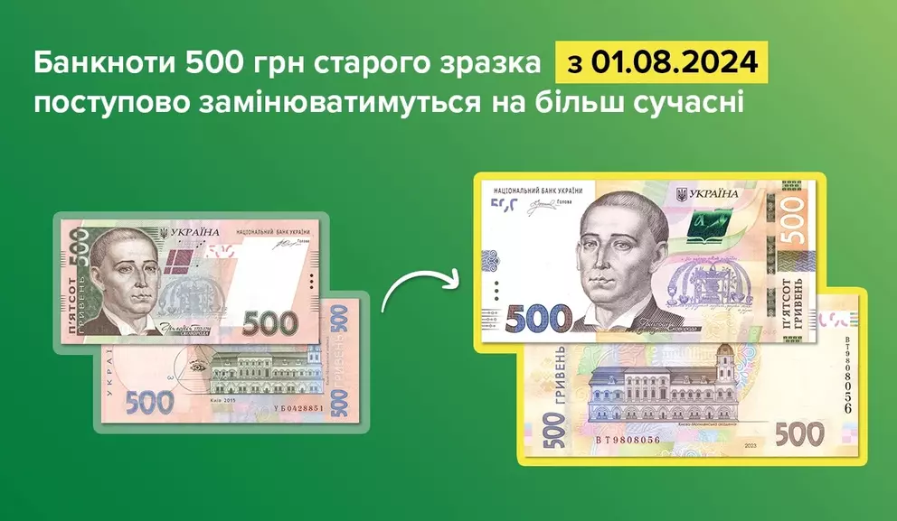 Віднині Національний банк України (НБУ) розпочинає процес вилучення з обігу банкноти номіналом 500 гривень старого зразка. Це стосується купюр 2003-2007 років випуску. Поступово їх замінять на банкноти 2014 року і наступних років випуску. Натомість вони все ще залишатимуться дійсними платіжними засобами.