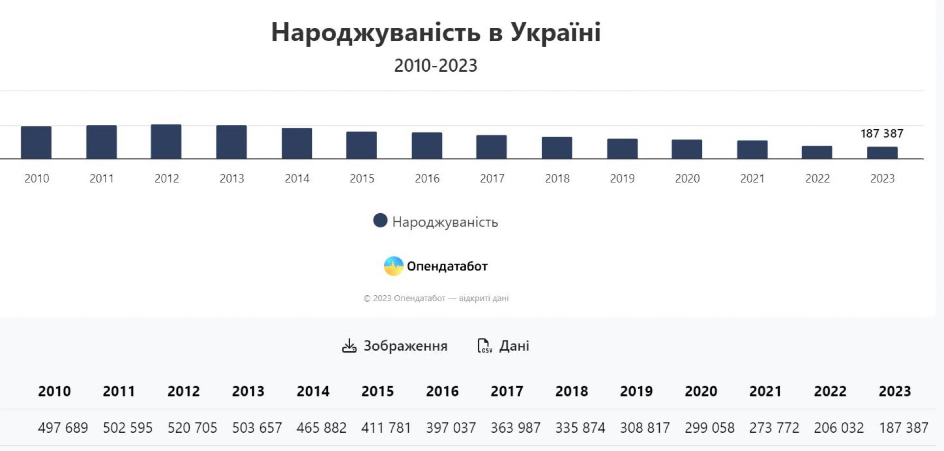 У перший рік повномасштабної війни кількість новонароджених різко впала — аж на 25%, до 206 тисяч дітей. Для порівняння, у період 2010 - 2013 роки в Україні народжувалось близько півмільйона дітей на рік. Рекордним був 2012 рік.