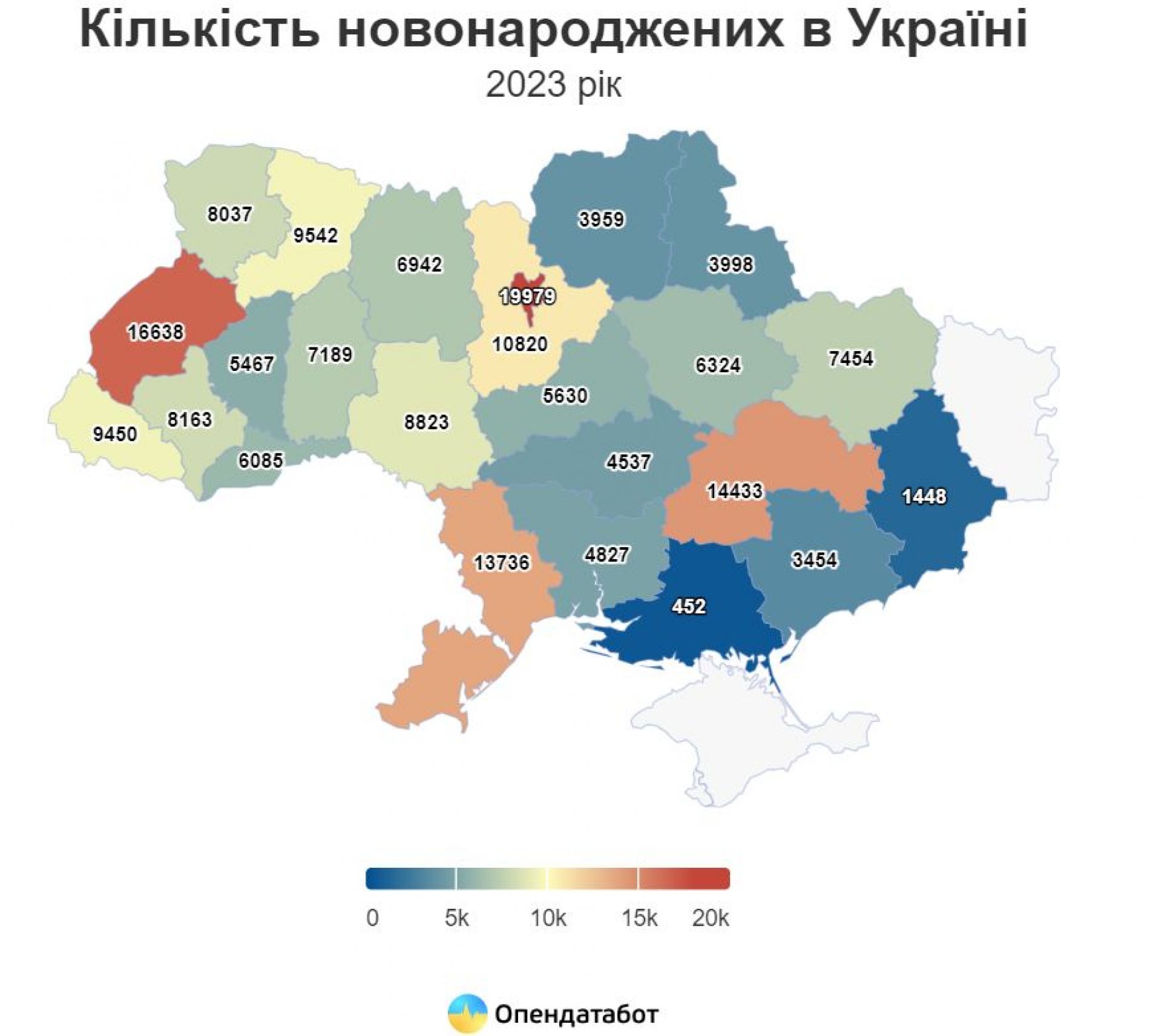 Найбільший спад народжуваності у 2023 році, не враховуючи тимчасово окуповані території та території бойових дій, зафіксовано у Києві — 19 979 малюків - на 33% менше, ніж у 2021 році.