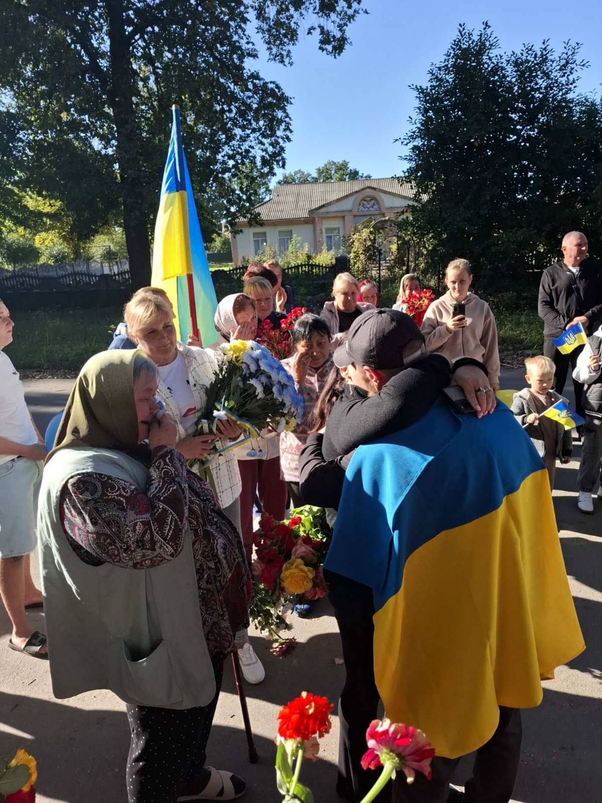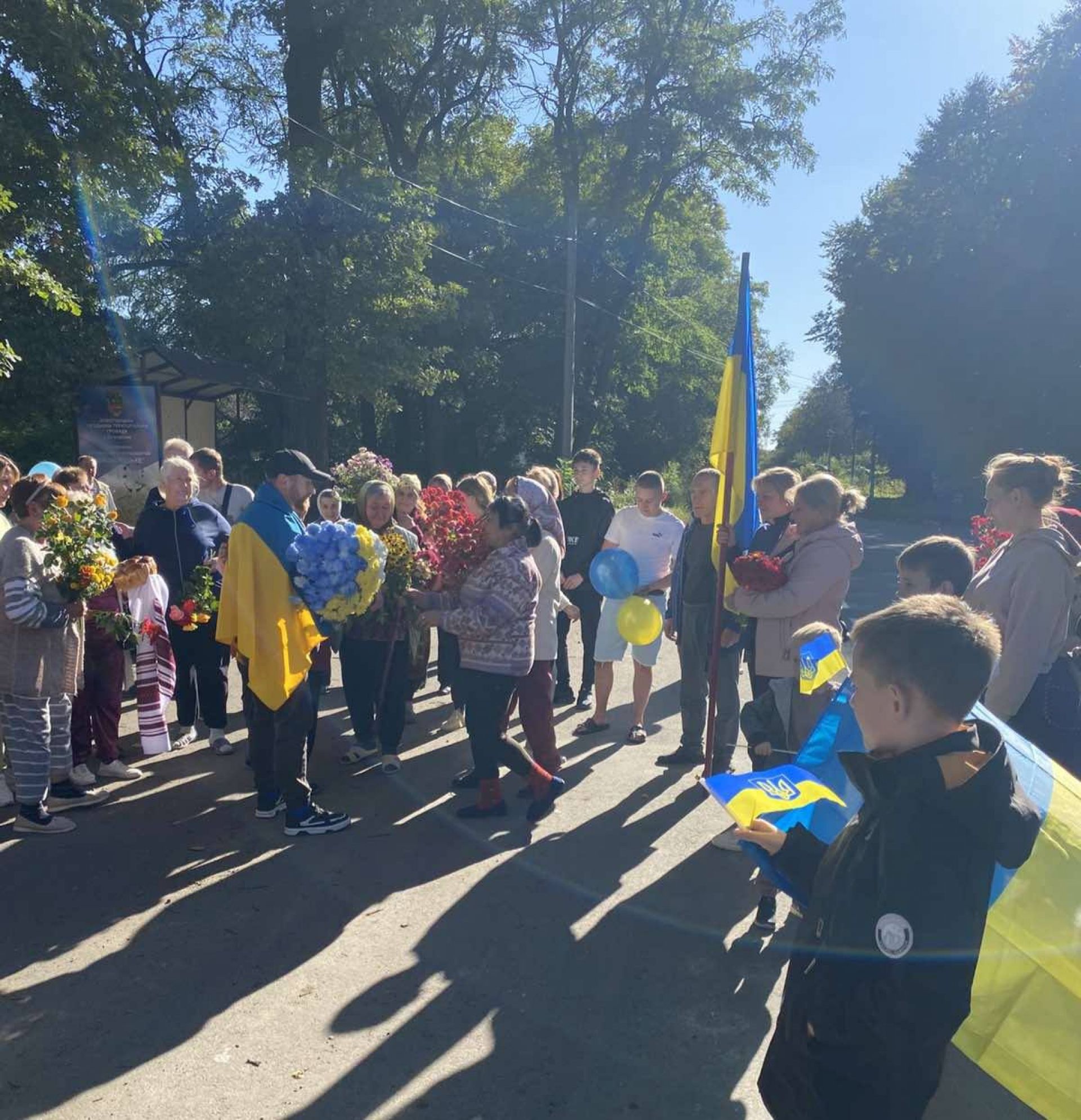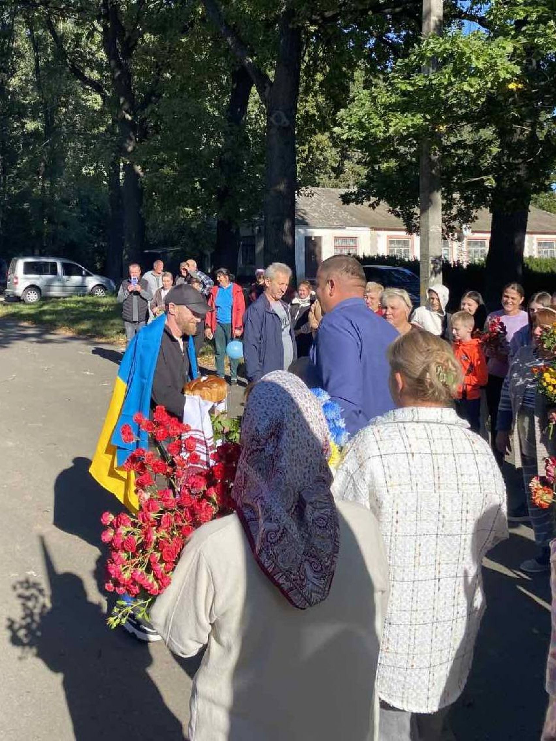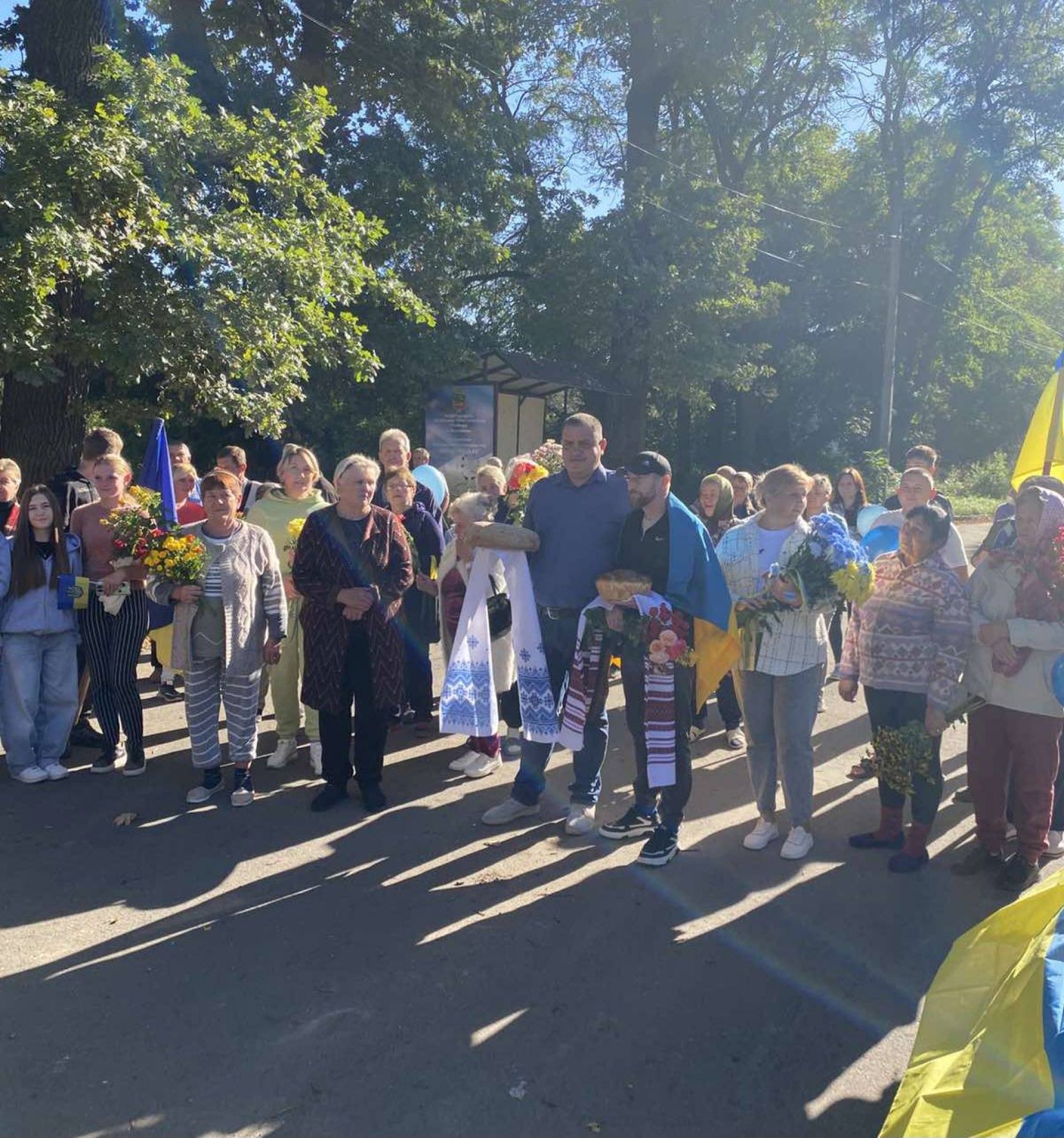 Щоб привітати захисника, мешканці громади вийшли з квітами, прапорами та традиційним хлібом-сіллю. Люди подякували Павлу Демчуку за відвагу та побажали йому швидкого одужання, миру і добра.