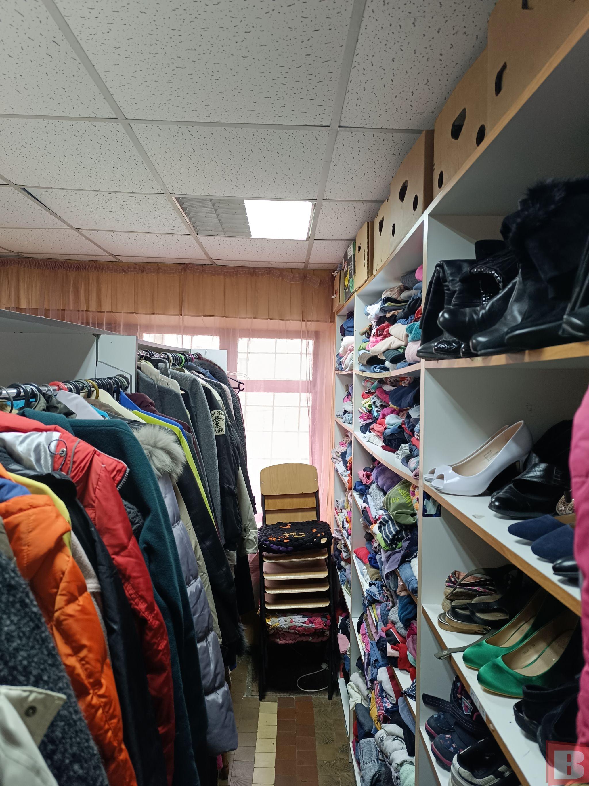 В одній з кімнат волонтерського пункту тут розміщений одяг. Жінки все сортують і акуратно вивішують речі, які приносять сюди хмельничани. Буває навіть одяг з бірками. Окремо є стелаж із взуттям – дитячим, жіночим на підборах, менша кількість – чоловічого.
