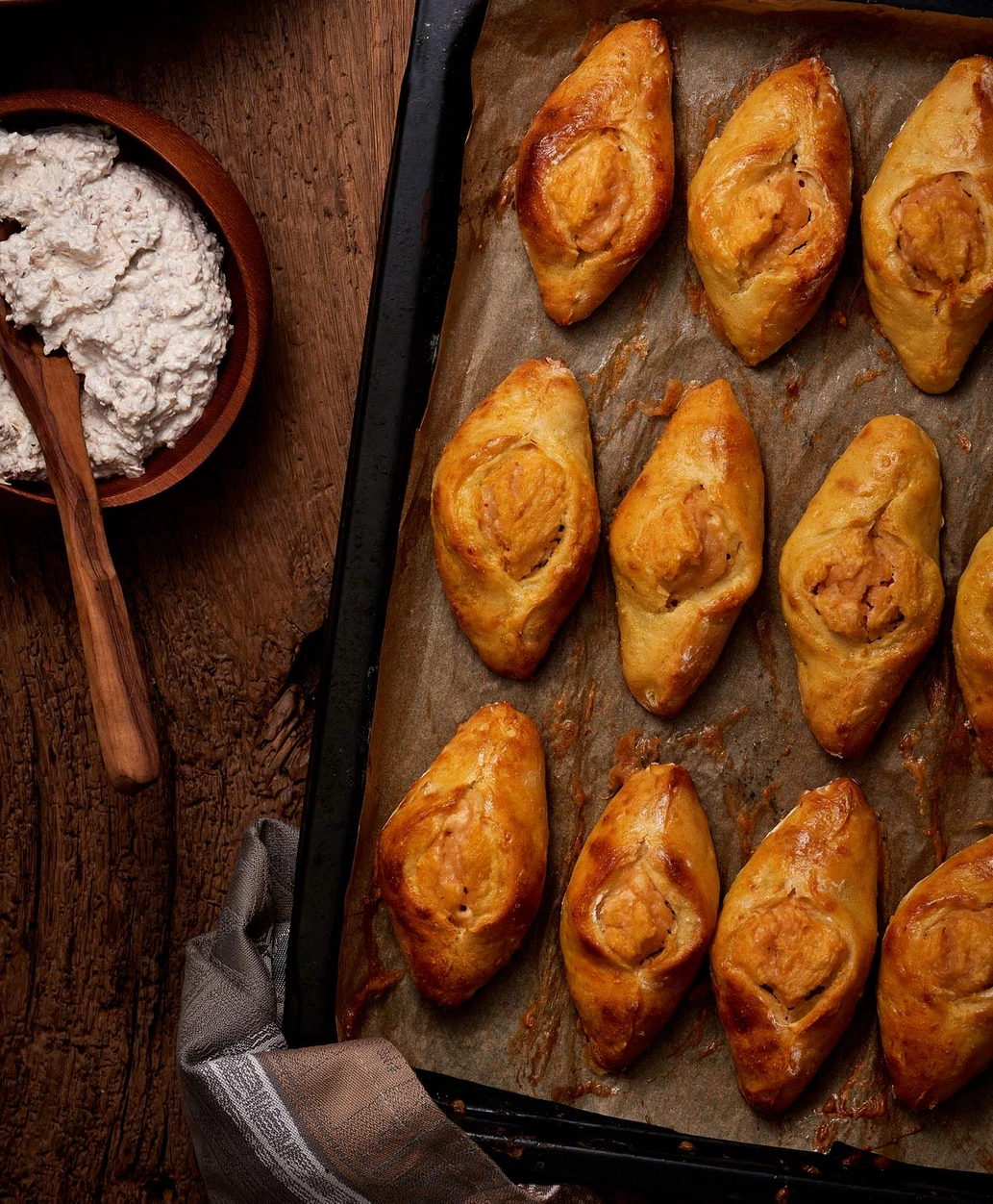 А найпершою згадкою про цю страву вважають записи у щоденнику одного мандрівника, який назвав ще невідому тоді страву «печивом із начинкою», якою, за його словами, пригощали лише найбільш бажаних гостей. Детальний рецепт читайте за посиланням.