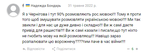 - Я з Чернігова і тут 90% розмовляють російською мовою! Тому я проти того, щоб змушувати розмовляти українською мовою! Ми так звикли і для нас це дуже дивно і складно!!! Ви ж самі даєте привід для рашистів!!!! Ви ж самі казали і писали, що тут ніхто не гнобить мову на якій розмовляєш!!! Навіщо зараз розпалювати цю ворожнечу? Тим паче в час війни!