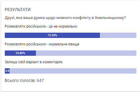 У попередньому матеріалі журналістка vsim.ua залишила опитування для хмельничан. Запитала думку людей щодо описаного мовного конфлікту. Загалом у ньому взяли участь 647 людей.