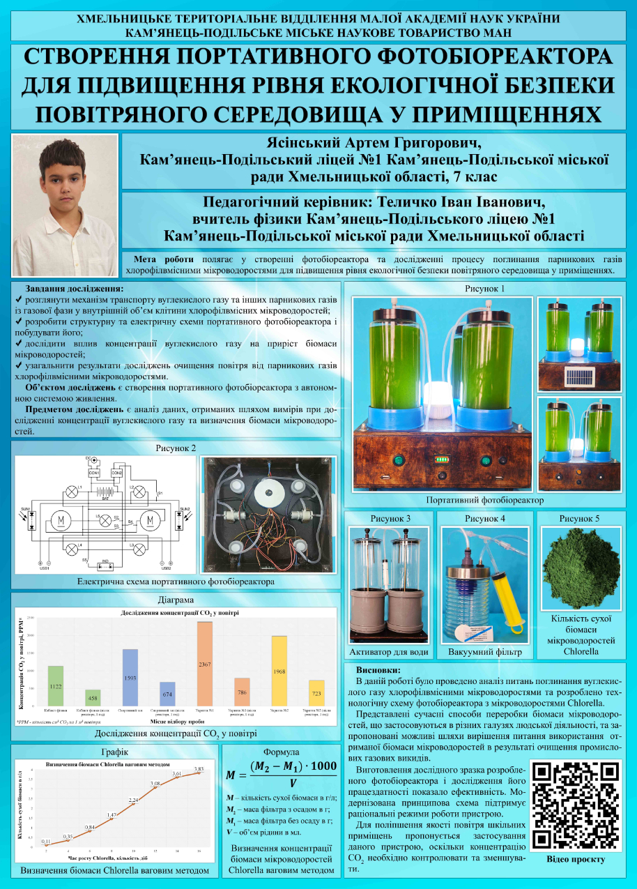 Як йдеться в дописі, вихованець кам’янецького ліцею №1 взяв участь у Всеукраїнському конкурсі «InventorUA». Це так звана платформа для презентації ідей, здатних змінити майбутнє. Конкурс проводив Національний центр «Мала академія наук України» 6-9 грудня. Там Артем Ясінський представив «створення портативного фотобіореактора для підвищення рівня екологічної безпеки повітряного середовища у приміщеннях». Відтак, серед 196 робіт учасників юний кам’янчанин здобув перше місце в номінації «Збереження здоров’я та лікування хвороб».