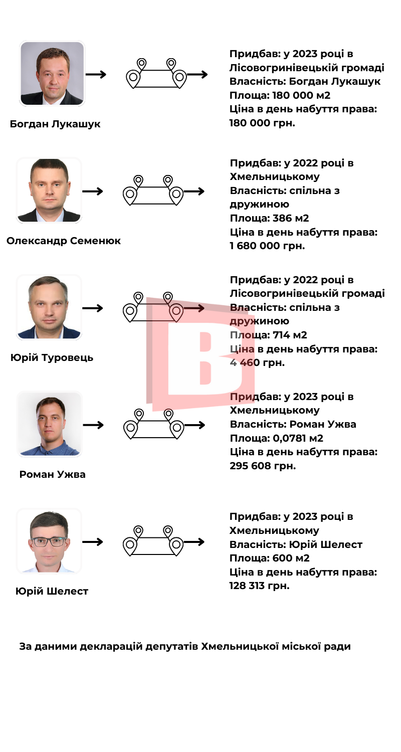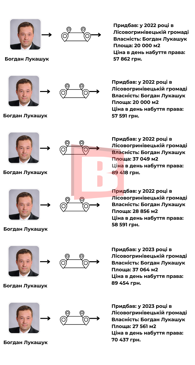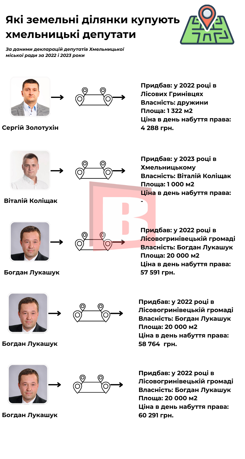 Наприклад, Богдан Лукашук у 2022 році купив 7 земель у селах Терешівці та Гнатівці. Найдорожча з них в день набуття права власності коштувала майже 90 тисяч гривень. У Лісовогринівецькій громаді придбав землю депутат і минулого року. Це три земельні ділянки, найдорожча з яких коштувала 180 тисяч гривень.