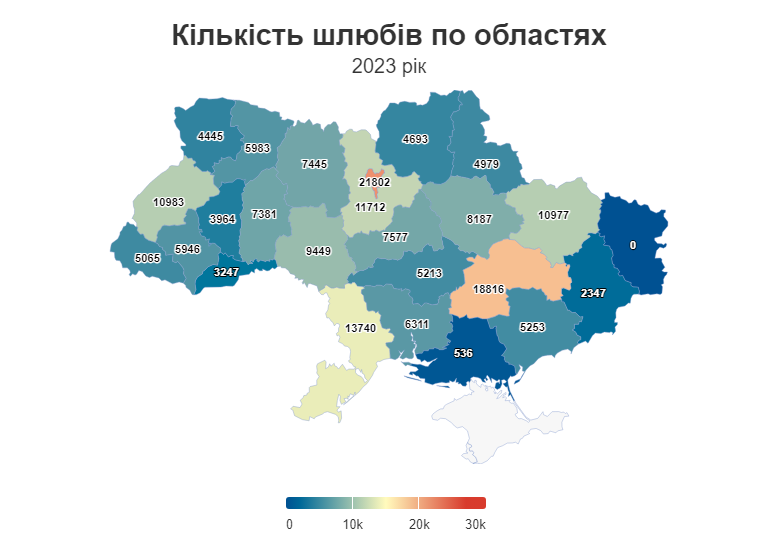 У 2023 році в Україні зареєстрували 186 051 шлюб. До прикладу, в 2022-му ця цифра була більшою - 222 890 шлюбів.