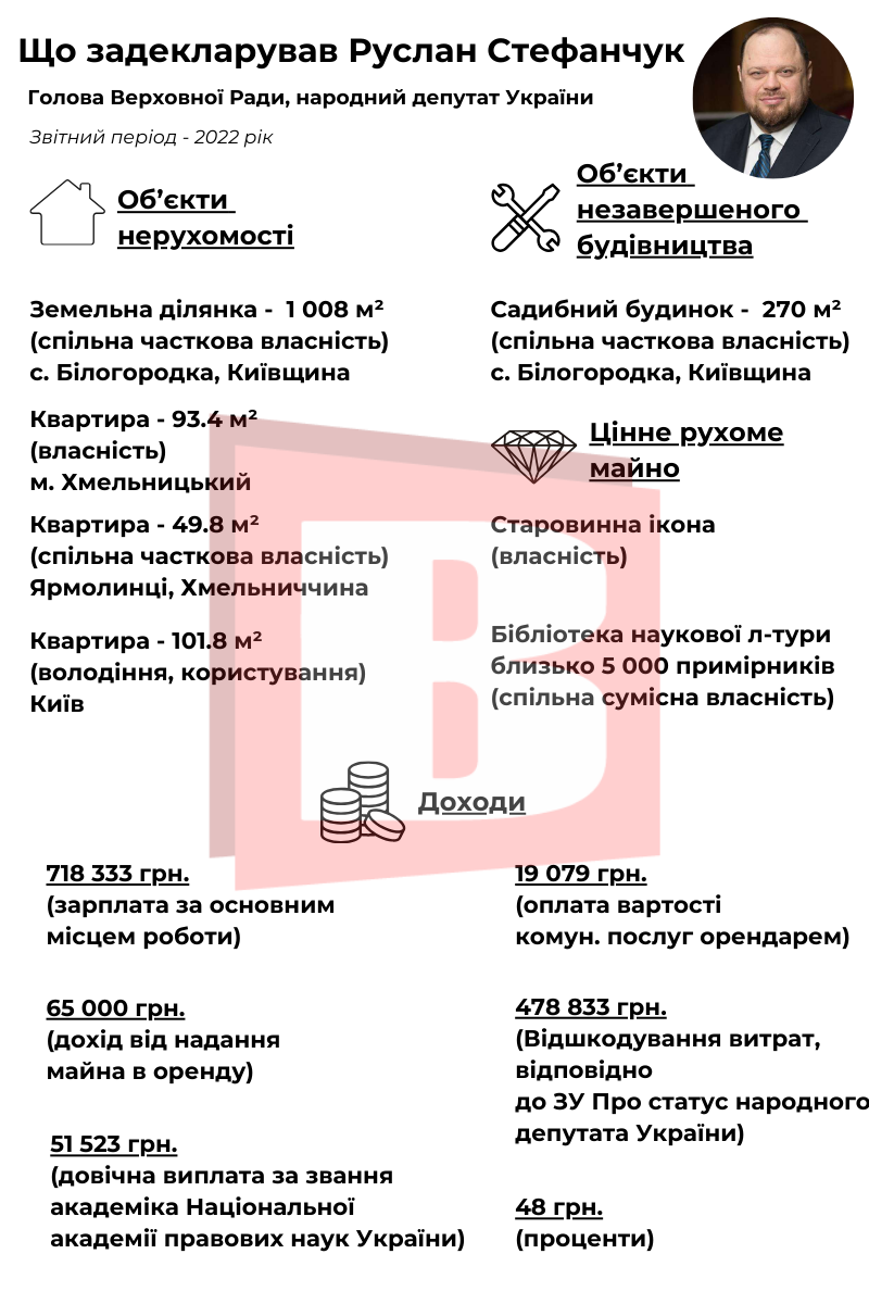 Згідно з документом, за основним місцем роботи Руслан Стефанчук заробив за рік більш як 700 тисяч гривень.Також отримує прибуток від здачі майна в оренду. А саме - 65 тисяч гривень. Крім того, має відшкодування витрат, як народний депутат України. Це понад 400 тисяч гривень на рік. Руслану Стефанчуку платять довічну виплату за звання академіка Національної академії правових наук України.