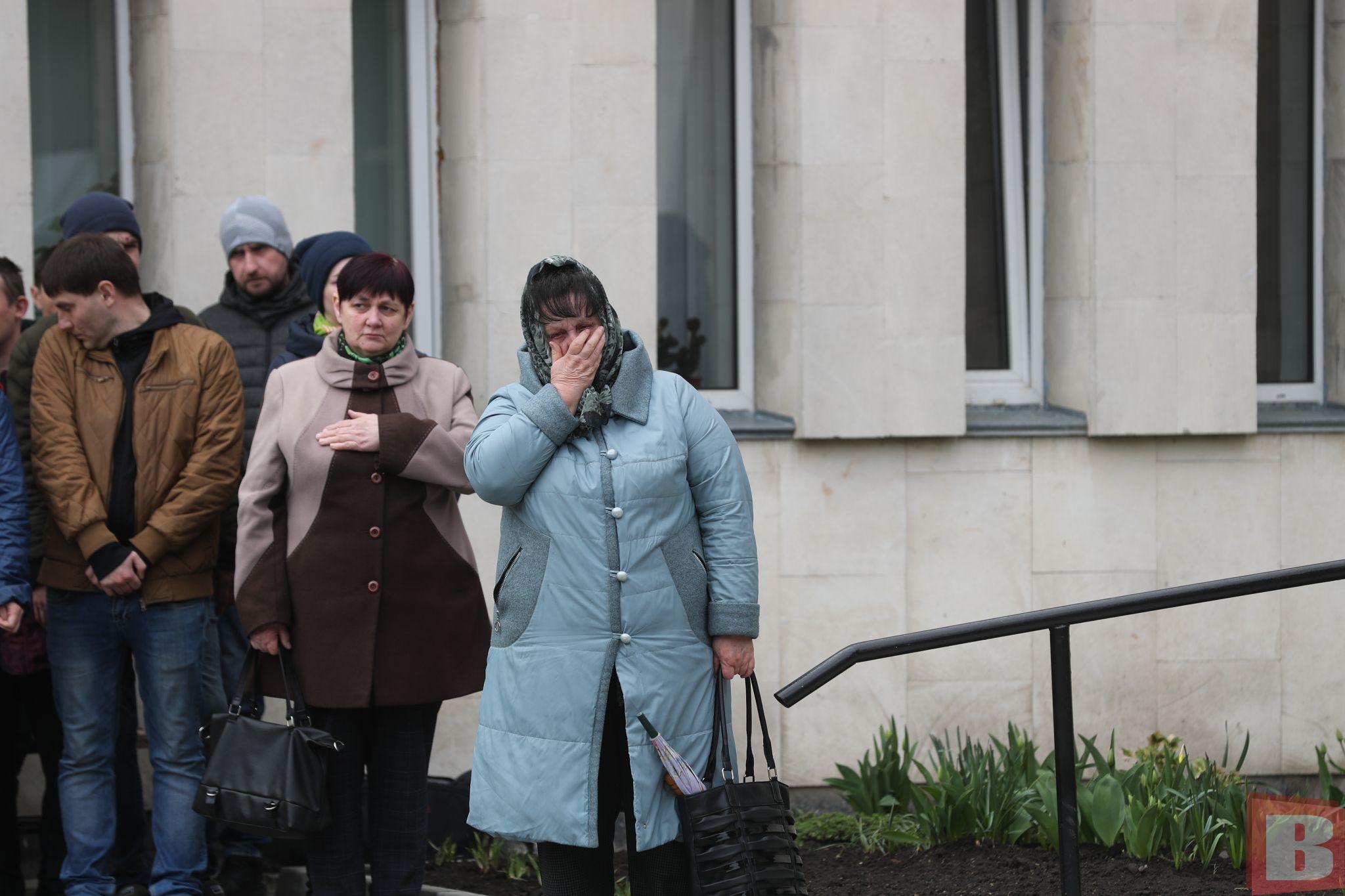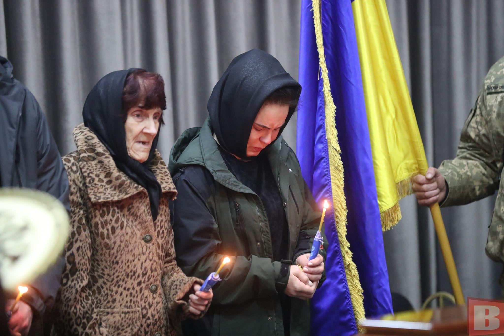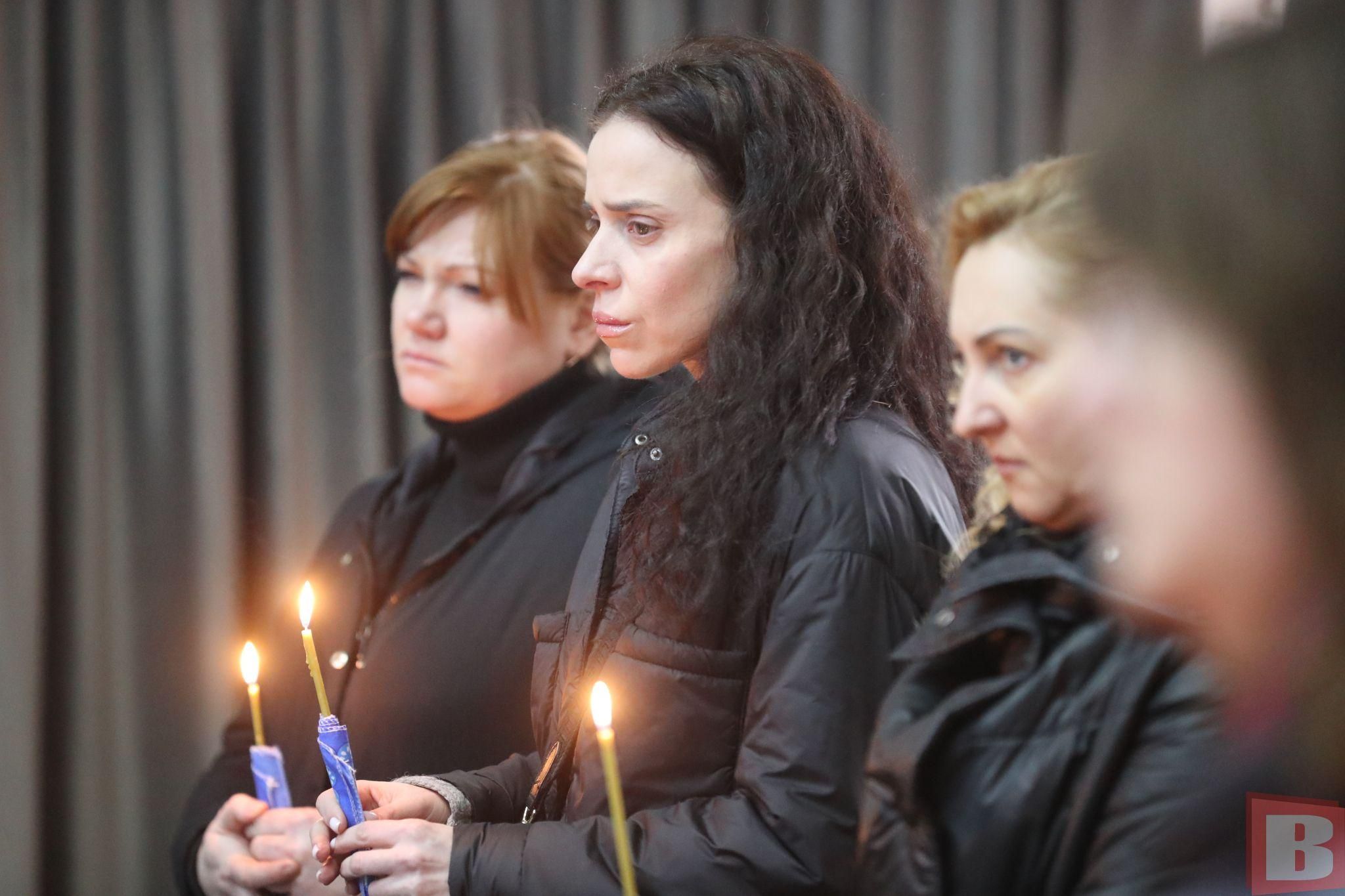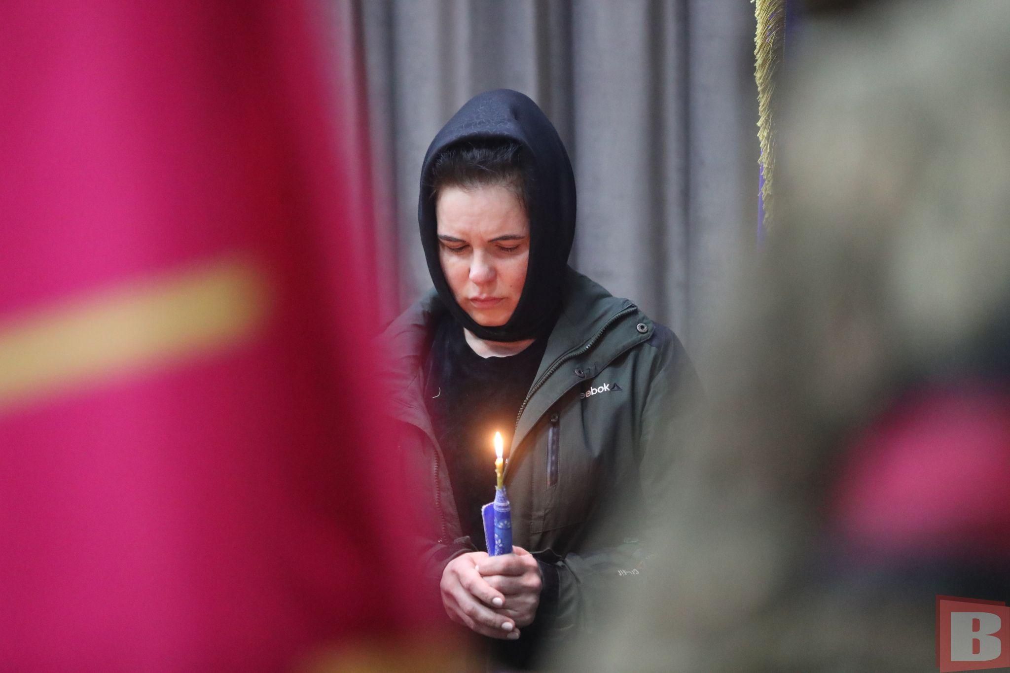 У залі для прощання зібралися рідні, друзі, знайомі загиблого. Біля закритої труни - дружина та мати. Вони тримають у руках свічки й не стримують сліз. Адже війна забрала в них найдорожче.
