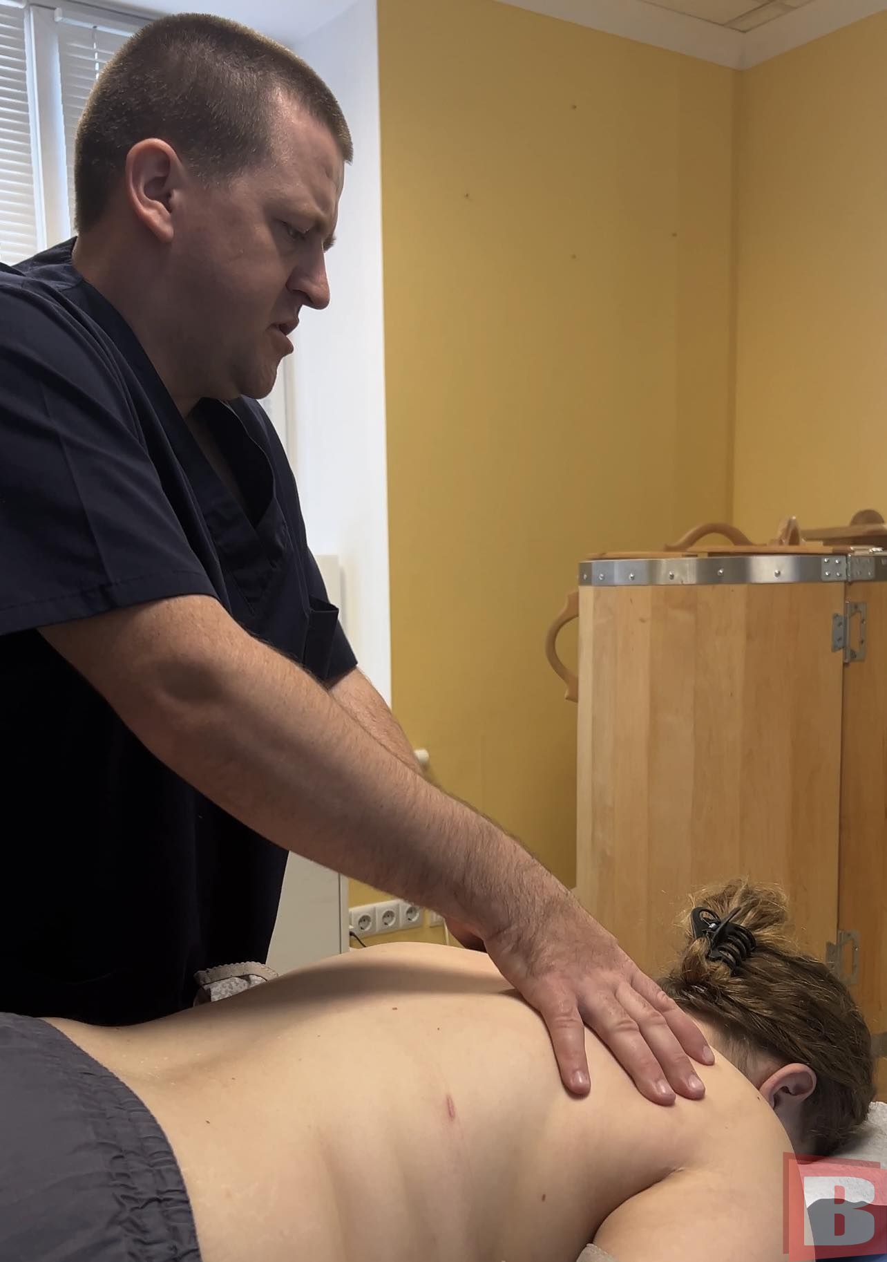 - У вас тут відчувається протрузія. Ці ущільнення на дотик, як бульбашки, – каже масажист Антон, працюючи із пацієнткою.