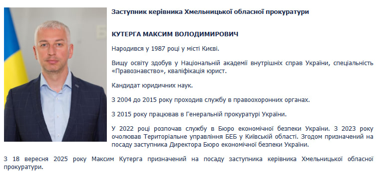 Восени 2025 року у керівника Хмельницької обласної прокуратури Антона Ковальського з’явився ще один заступник — Максим Кутерга. Згідно із біографією, він працював у правоохоронних органах, Бюро економічної безпеки, очолював київський БЕБ. Водночас журналісти-розслідувачі встановили, що у біографії Максима Кутерги відсутні певні факти, зокрема й те, що у 2019 році він не пройшов атестацію прокураторів. Дізналися, що його дружина придбала у 2024-му майна на 13 мільйонів гривень, яких, згідно із деклараціями, родина не має.