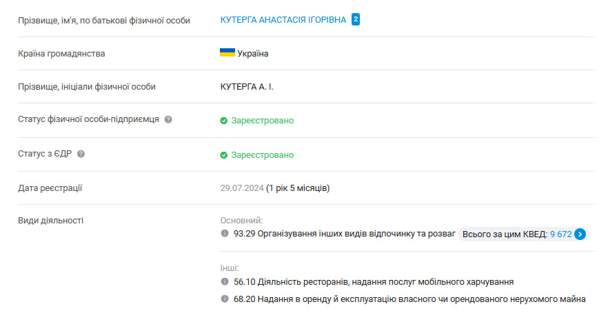 Враховуючи купівлю всього вище згаданого майна, потрібно б було витратити орієнтовно 13 000 000 грн. Однак, опираючись на дані декларації, бачимо, що за 2024 рік Максим Кутерга отримав, враховуючи усі джерела доходу, 1 204 113 грн. Його дружина — 2 695 075 грн за продаж нерухомого майна, а також 1 673 600 грн за заняття підприємницькою діяльністю. До слова, ФОП Анастасія Кутерга зареєструвала у липні 2024 року.