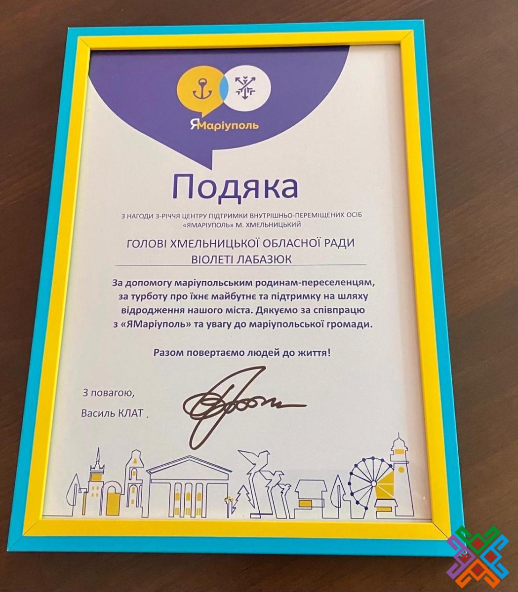 З нагоди третьої річниці з дня відкриття Центру «Я-Маріуполь» Віолета Лабазюк вручила працівникам осередку грамоти обласної ради та цінні подарунки. А керівник Центру Василь Клат від імені маріупольців вручив Віолеті Лабазюк подяку за допомогу маріупольським родинам-переселенцям, за турботу про їхнє майбутнє та підтримку.