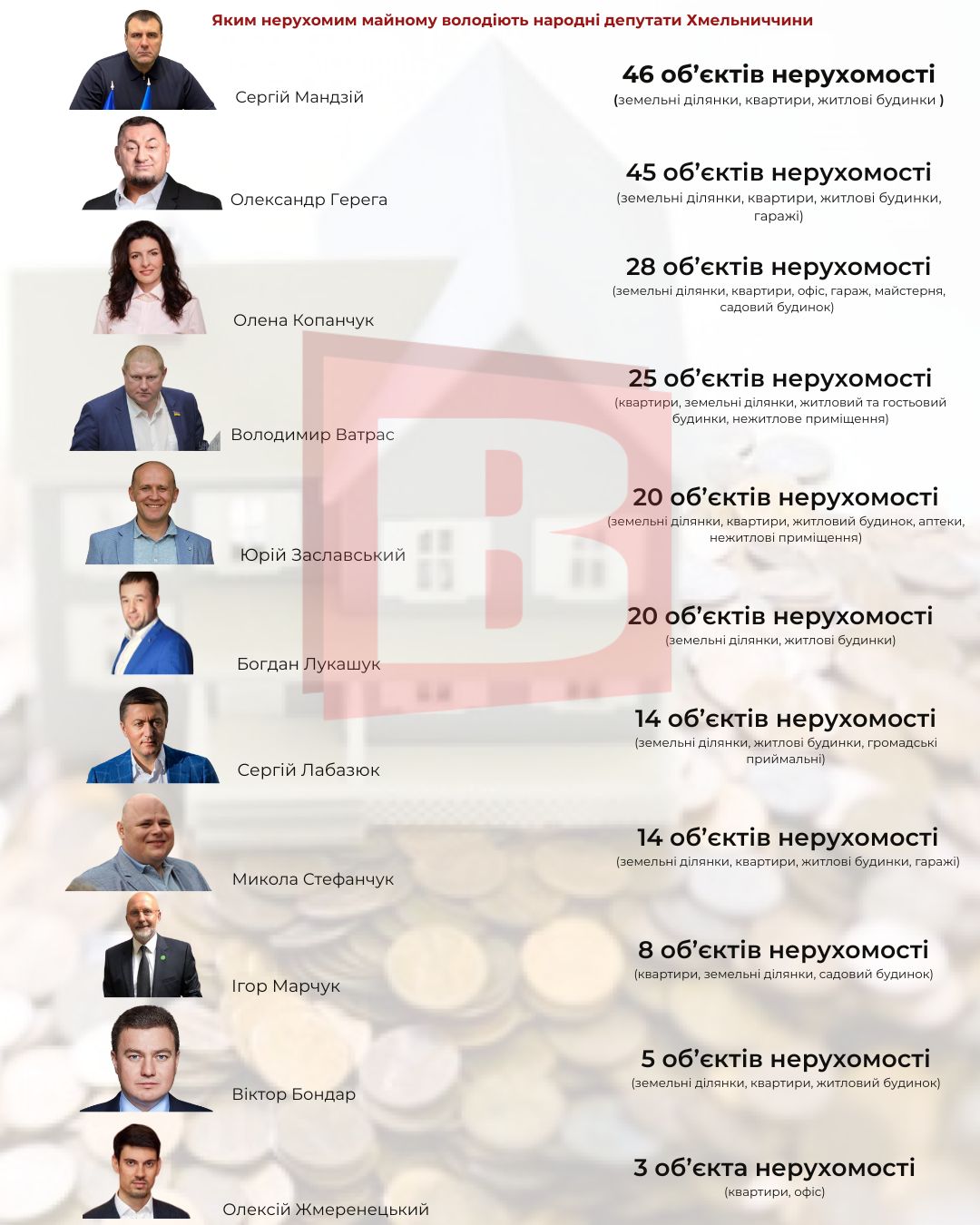 Десятки земельних ділянок, елітні квартири в Києві та житлові будинки — 11 хмельницьких нардепів разом задекларували 228 об’єктів нерухомості. Найбільше їх у Сергія Мандзія — 46. Найменше — в Олексія Жмеренецького.