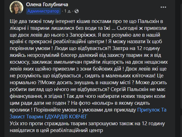 - Ще два тижні тому інтернет кішив постами про те що Пальохін в лікарні і тварини лишилися без води та їжі. Сьогодні ж привезли ще двох левів до нього з Запоріжжя. Я все розумію, але в нашій країні є прекрасні реабілітаційні центри! Я можу назвати їх, щоб порівняли умови! Люди що відбувається?! Завтра на 12 годину якийсь незрозумілий блогер далекий від захисту тварин як я від космосу, закликає хмельничан прийти ліцезрєть на двох нещасних левів, яких щойно привезли з зони бойових дій ! Двох левів які ще не розуміють що відбувається , сидять в маленьких кліточках! Це нормально?! Може досить знущань в нашому місті ? Може досить удавати, що нічого не відбувається? Сергій Пальохін не має фінансування, я згідна! Так для чого набирати нових тварин коли цим ради дати не годен, – зазначає в дописі Олена Голубнича.