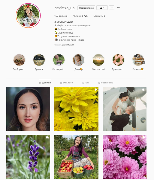 “Я Марія і я навчаюсь у свекрухи: любити село, садити город, готувати смаколики, робити есо hand - made”, - такий напис зустрічає підписників Марії в Instagram.