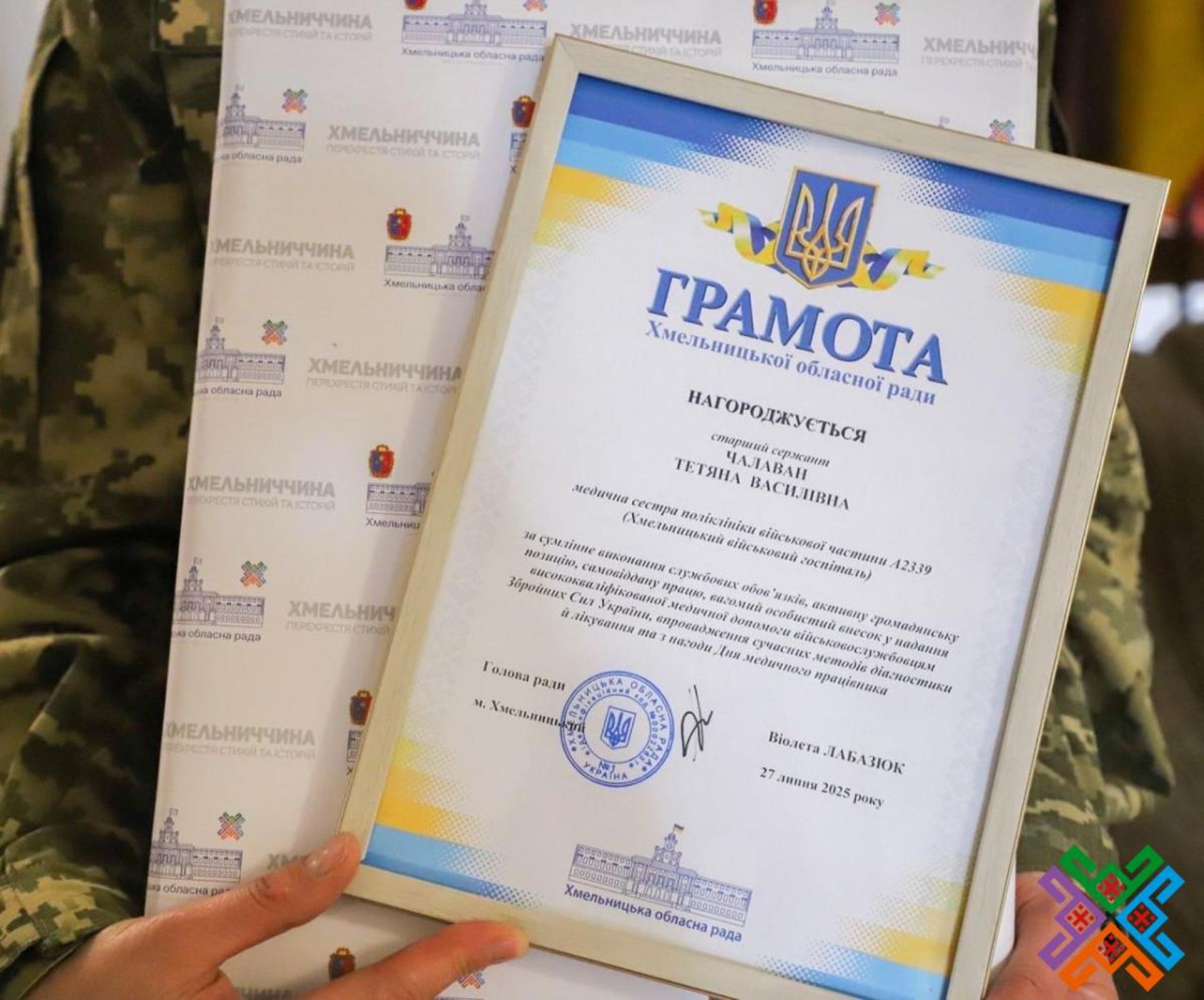 Напередодні Дня медичного працівника у Хмельницькому відзначили одну з представниць військової медицини. Голова обласної ради Віолета Лабазюк зустрілася з Тетяною Чалаван — медсестрою поліклініки місцевого військового госпіталю.