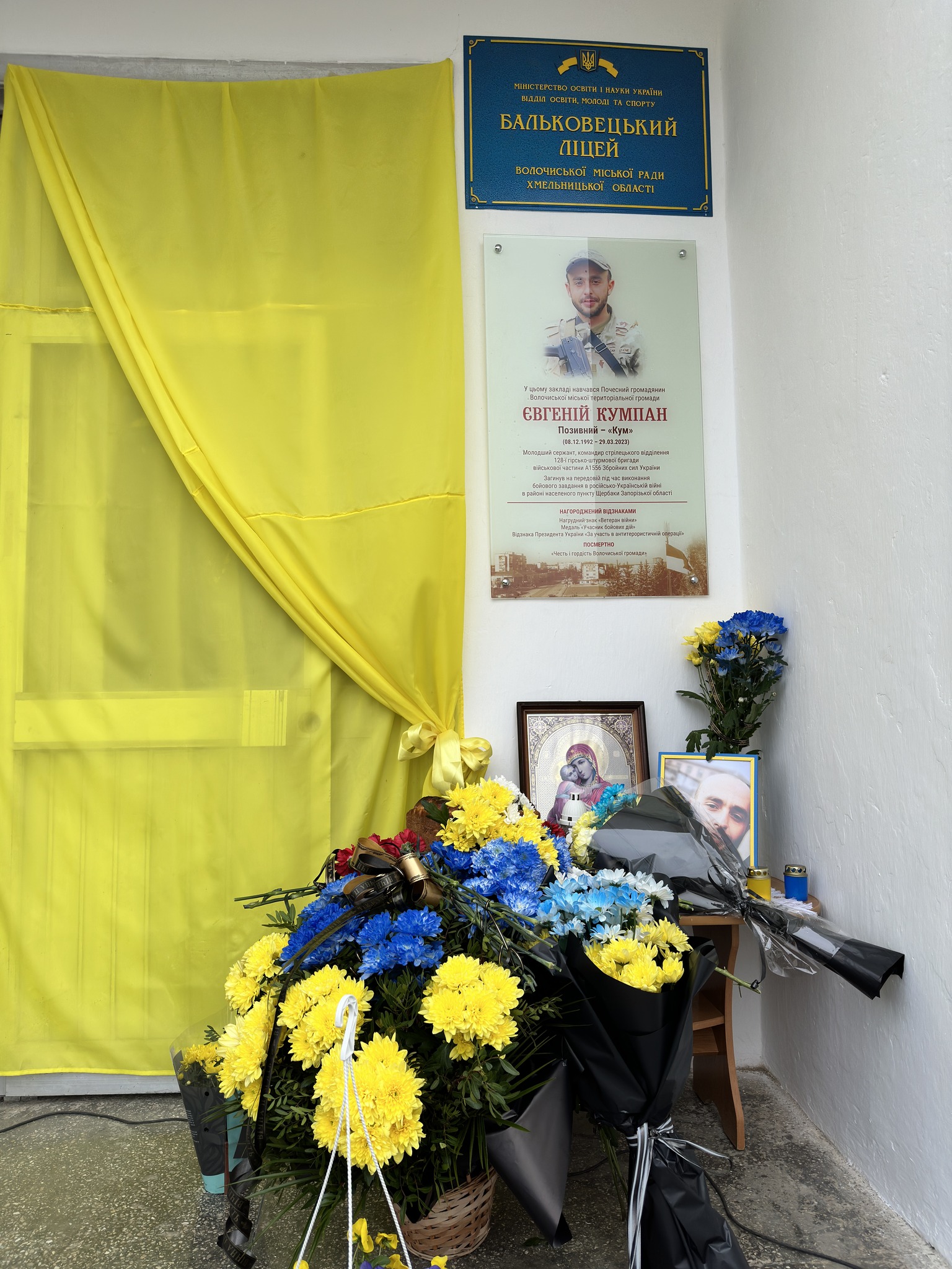 У селі Бальківці Волочиської громади встановили меморіальну дошку на честь загиблого воїна Євгенія Кумпана. 28 березня пам’ятку відкрили на фасаді місцевого ліцею, де навчався Герой.