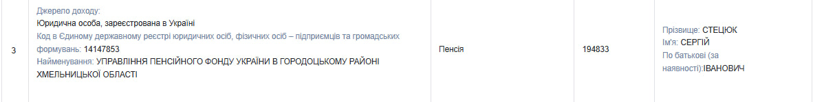 Згідно із останньою декларацією прокурора, торік він отримав майже 200 000 грн пенсійних виплат.