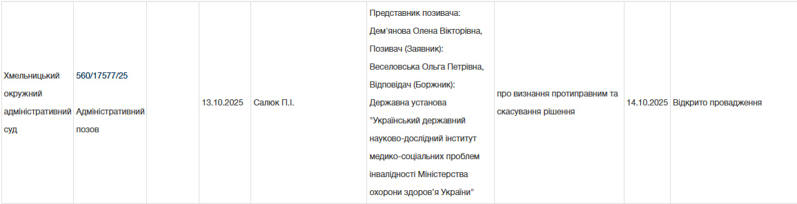 Водночас Ольга Веселовська пішла до Хмельницького окружного адміністративного суду із позов до ДУ з вимогою скасувати рішення щодо її інвалідності. Суд відкрив справу. Розгляд триває.