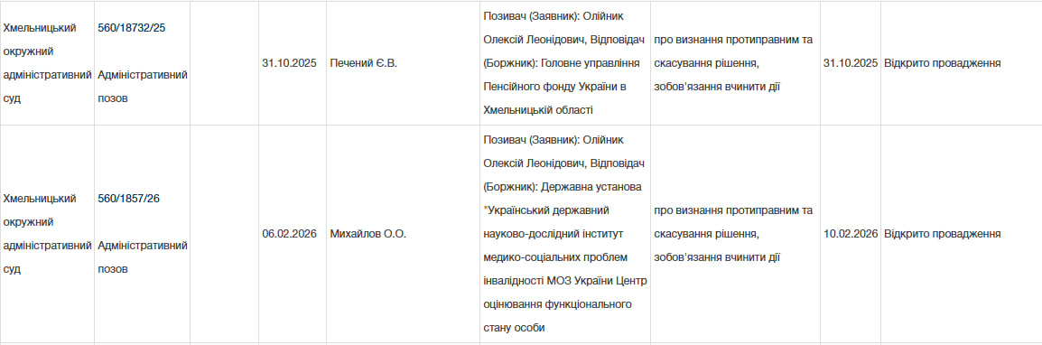 Ще один прокурор Хмельницької обласної прокуратури пішов до суду — Олександр Галищук. На початку квітня 2026 року він виграв справу проти ДУ щодо скасування його ІІ групи інвалідності.