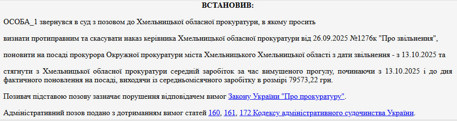 Як вказано в матеріалах справи, у листопаді 2019 року Хмельницька обласна МСЕК встановила прокурору ІІ групу інвалідності. У січні 2023-го її продовжили до лютого 2026 року.