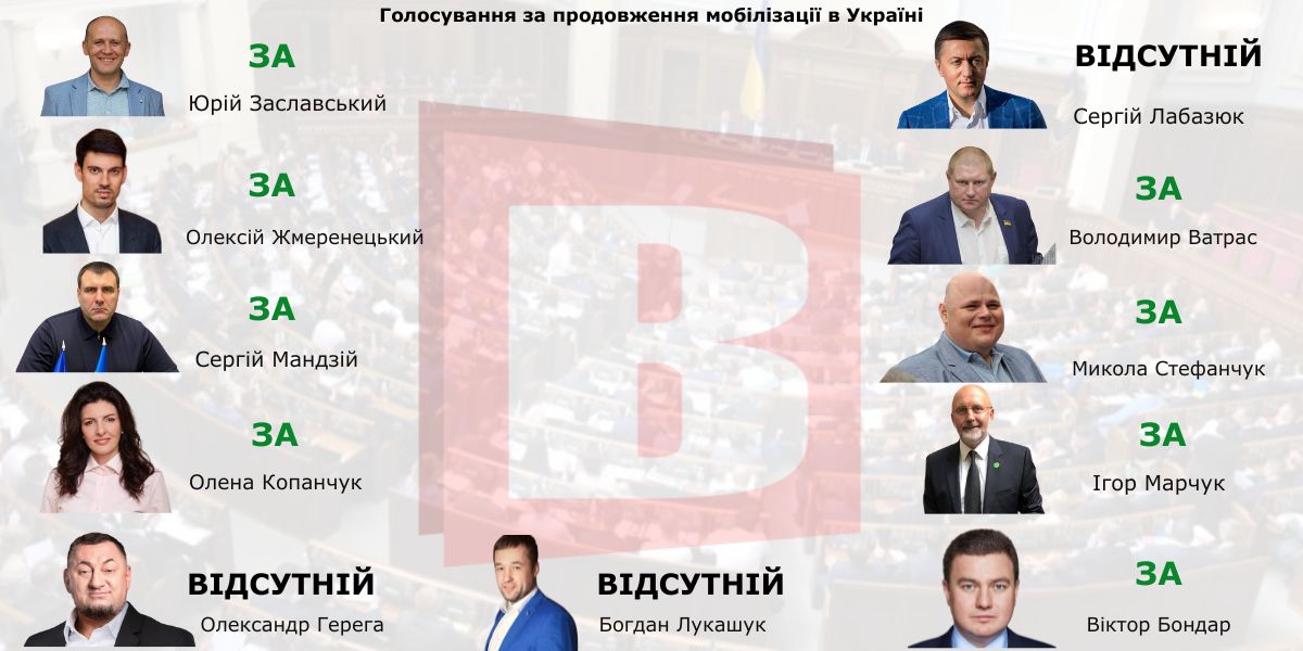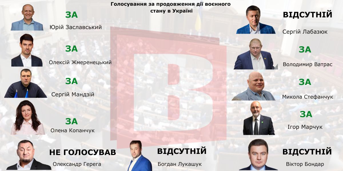 Також був відсутній Богдан Лукашук. Решта — були у сесійній залі, щоправда, не за все голосували. Наприклад, під час рогляду питання про продовження дії воєнного стану не було Віктора Бондаря, який є одним із підозрюваних у корупційній схемі розкрадання на «Укрзалізниці». А ось за мобілізацію проголосував «ЗА».